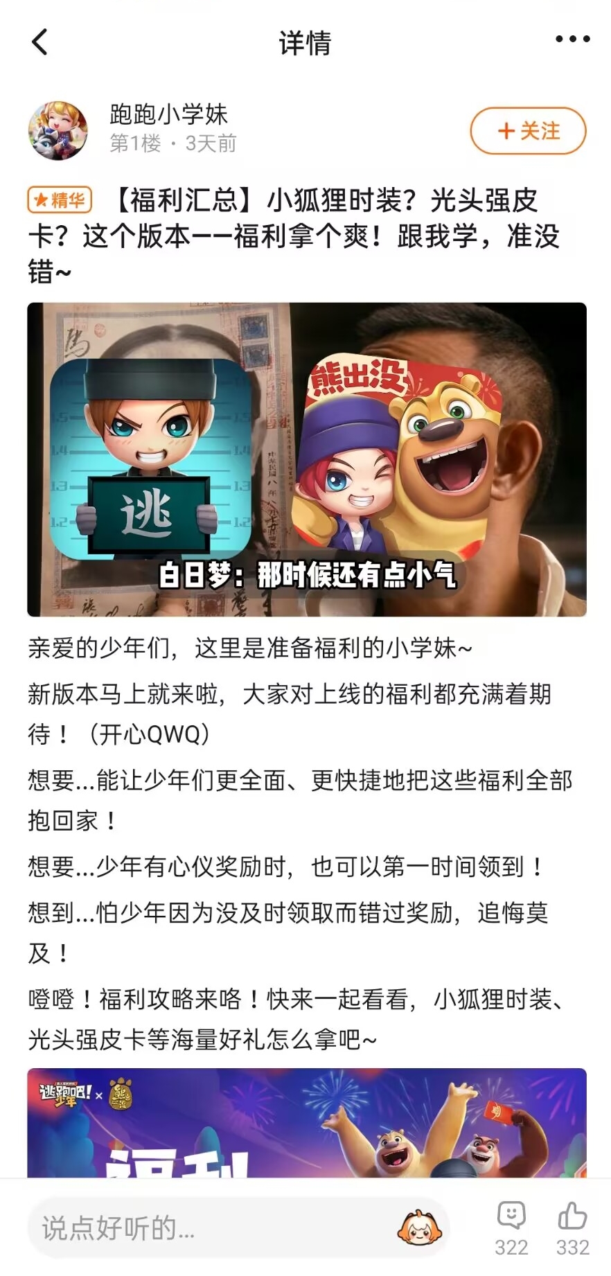 哈喽大家好这里是宁宁!最近逃少春节版本上线啦!熊出没礼包还有233娘发型等超多道具礼包大家都领到了吗~为了方便大家,宁宁把所有的福利整理成合集啦,大家跟我一起来看一下吧!