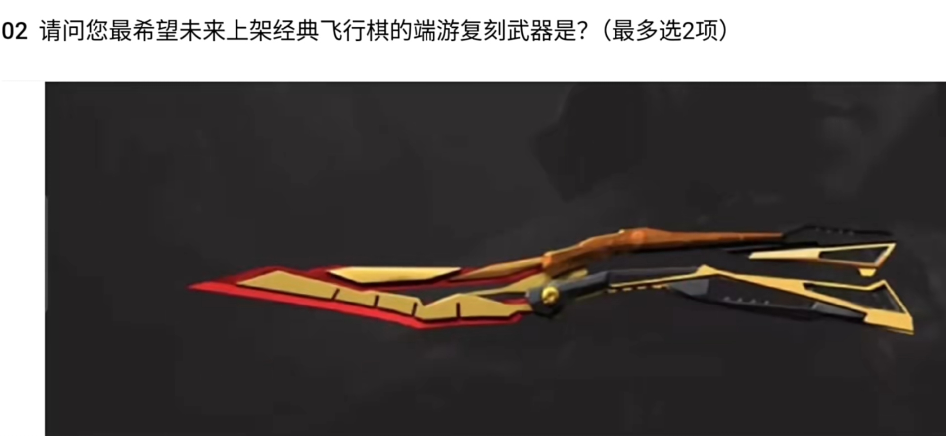 此外,前段时间游戏中发布了一则调研问卷,问大家希望哪些端游复刻武器未来加入经典飞行棋,列出的武器有SCAR-白虎、巴雷特-朱雀、炽芒蝶刃等等。至于最后会上架哪款武器暂时未知,但可以肯定的是飞行棋一定会上架更多新武器,现在囤一波王者之骰绝对是明智之举。