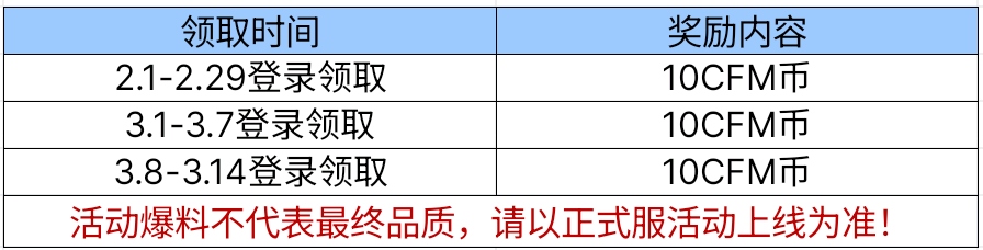 购买了武器基金的CFer可参与登录即领返还CFM币的任务,分3次领取返还的30个CFM币。下面是每次返还CFM币的时间,请大家自行预览。需要注意的是,不在领取时间则无法领取对应的CFM币,建议大家订阅领取奖励提醒,这样就不会造成损失了。