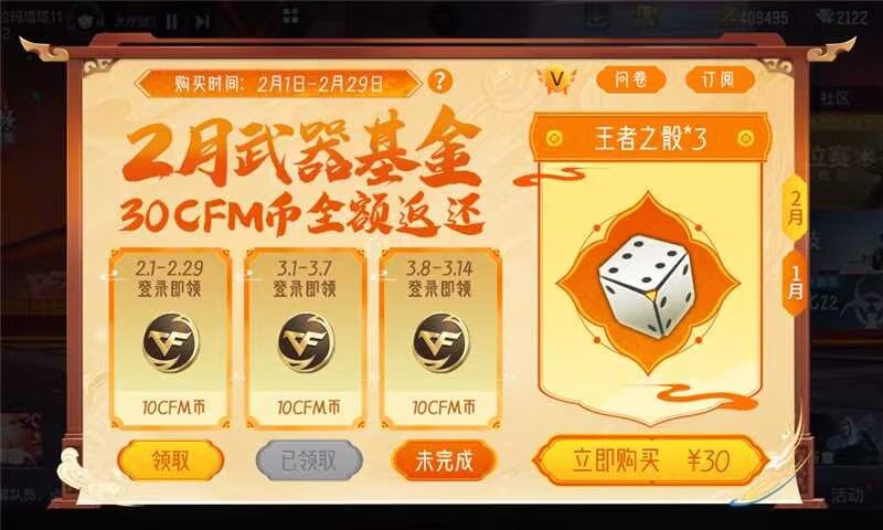 2月武器基金活动将在2月1日上线,请大家前往限时活动参与。和往期武器基金活动一样,该活动的购买时间为一个月,整个活动共持续一个半月。活动期间,大家可以花30元购买本期奖励王者之骰*3,购买该道具会正常累计火线幸运点和VIP成长值。