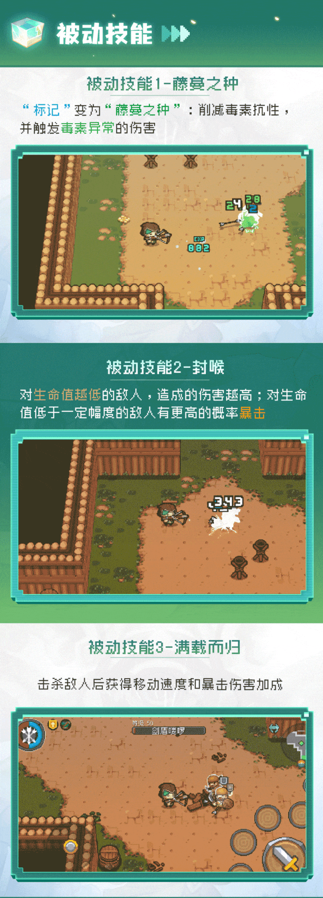 丛林射手的被动技能【藤蔓之种】延续了射手的“标记”状态,还融合药草师的毒素攻击;【封喉】突出一个落井下“毒”,面对血越薄的敌人伤害越高,完美体现战斗准则“快准狠”里的“狠”;【满载而归】则会让丛林射手越打越快,还能提高自身暴击伤害,搭配被动技能【瞄准】和【藤蔓之种】,实现消耗并收割大量敌人!
