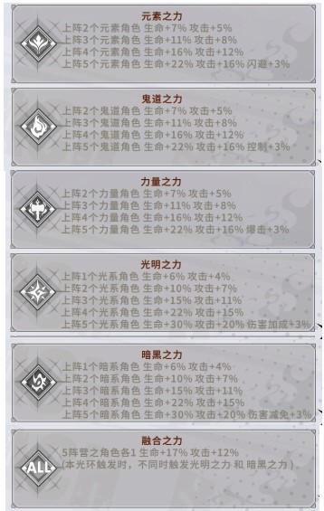 3.上阵的角色根据阵营的数量会触发全体强化的BUFF