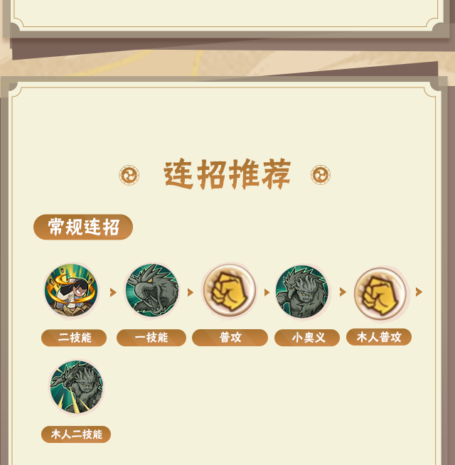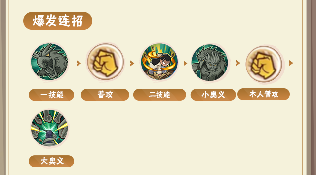 通过一技能远程攻击起手,随后用普攻3A连击,当对手替身时,利用二技能反制,随后开启小奥义进入木人状态,使用木人普攻打伤害,最后使用大奥义收尾。