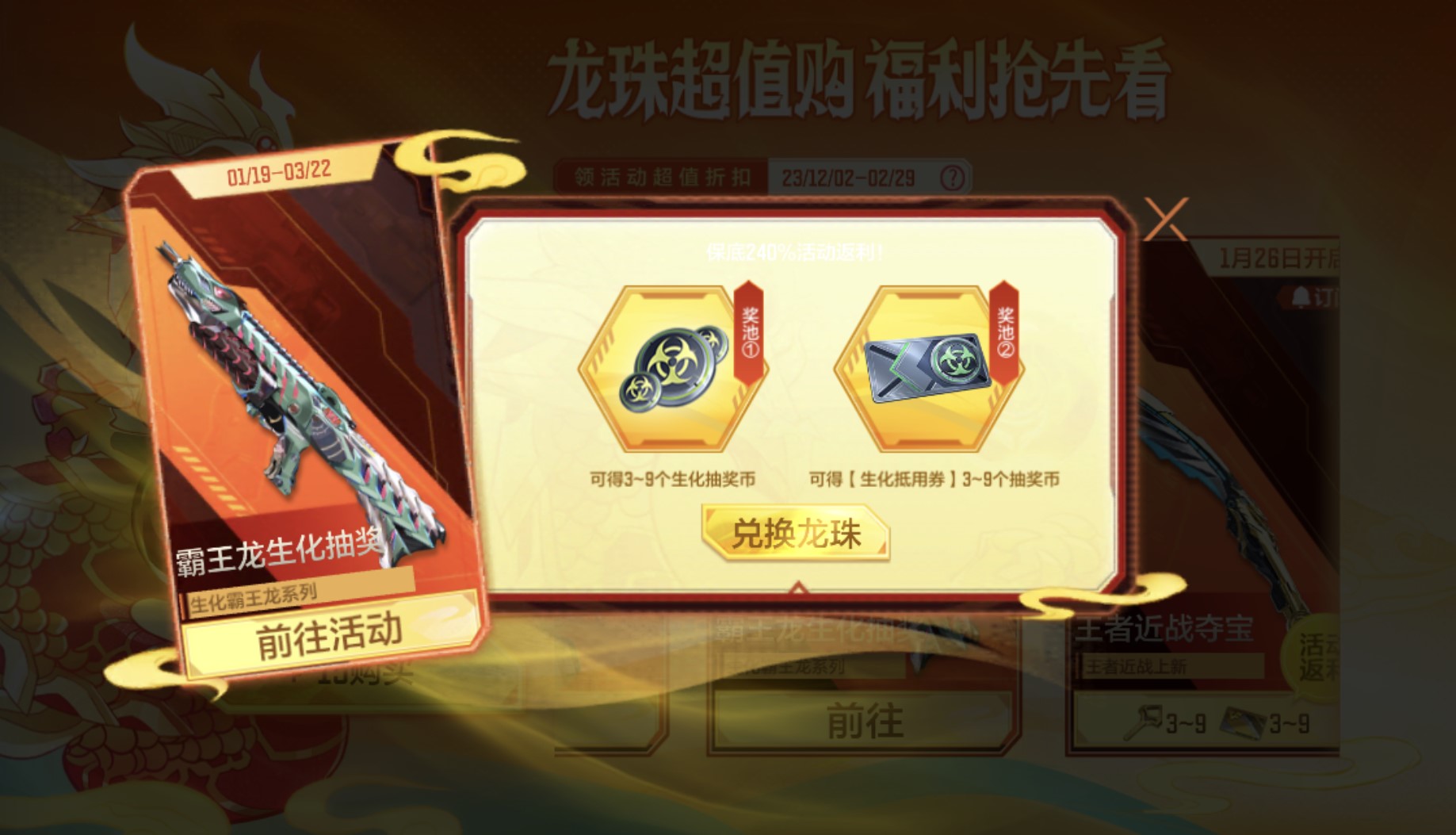 霸王龙生化夺宝活动时间为1月19日至2月18日,活动将持续一个月的时间。夺宝将为大家带来白垩纪时代的顶级掠食者——M1216-霸王龙、左轮-霸王龙、霸王龙斧以及霸王龙面罩等极品武器与道具!