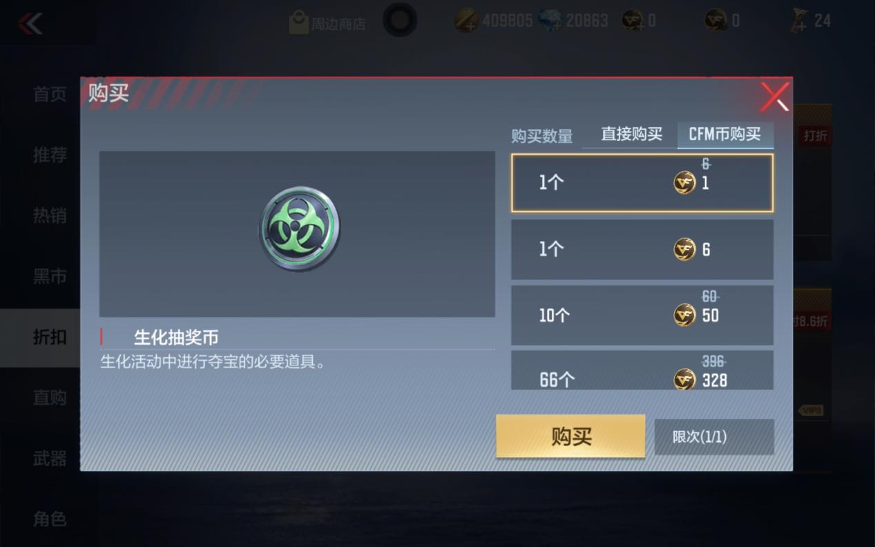 限时商城钜惠来啦!生化抽奖币一元购,七元七次单抽,你还在等什么?在游戏商城中,有一个为期7天的生化抽奖币一元购限时折扣钜惠活动!你没有听错,只需要一元,你就可以拥有一次单抽的机会!而且,如果你想要连续抽奖,只需要7元,就可以完成7次单抽!