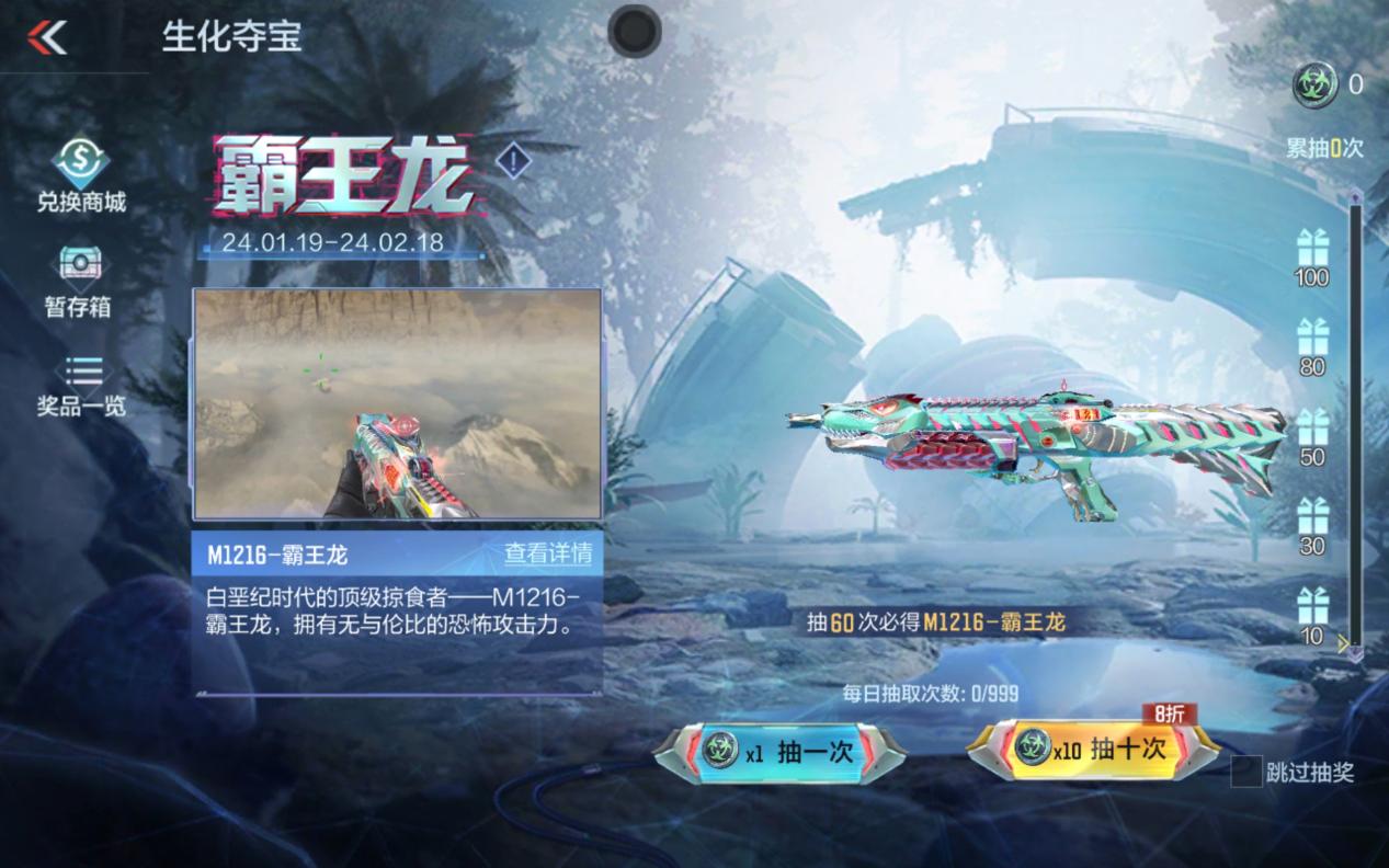 另外霸王龙生化夺宝活动还拥有累抽奖励!累计抽50次,即可领取5枚生化抽奖币,相当于5次单抽的机会!此时距离保底的60抽,仅剩最后的5抽!除了累抽奖励,还有生化兑换币可以领取。累计抽30次和100次时,可以领取总共20枚生化兑换币!如果觉得自己欧气不足,难以获得心仪的武器道具,就可以使用生化兑换币在生化夺宝的兑换商城中兑换!