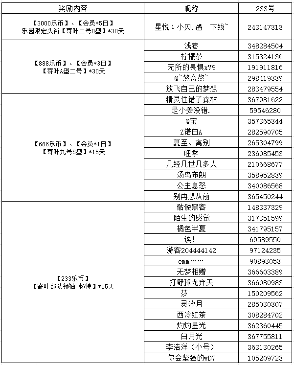 随机抽取1位特种兵送出:【3000乐币】、【会员*5日】、乐园限定头衔【寄叶二号B型】*30天