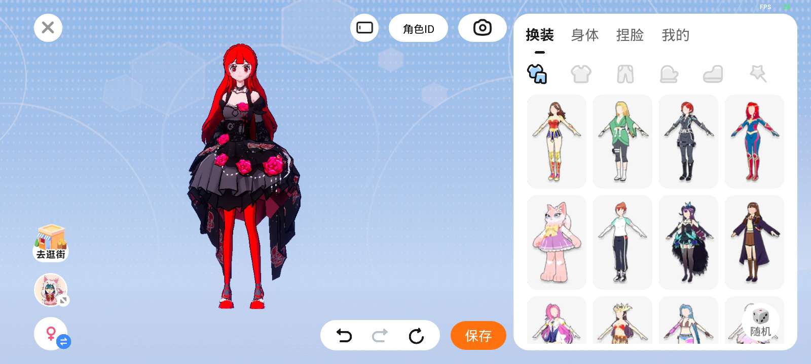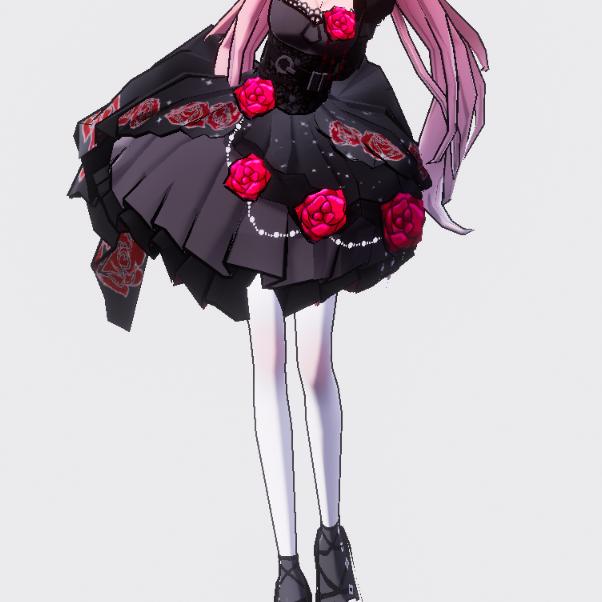 特点:红色长头发、衣服黑色上面有几个玫瑰、红袜子丶手上的玫瑰花