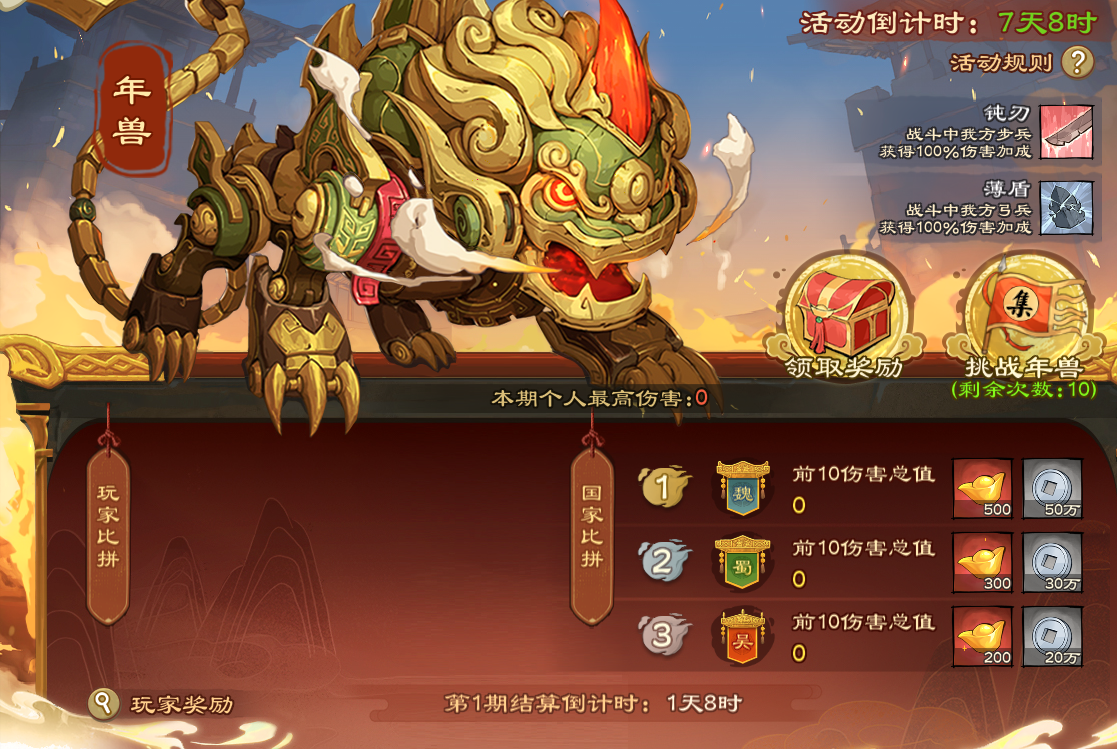 每期可挑战年兽10次,按伤害排名