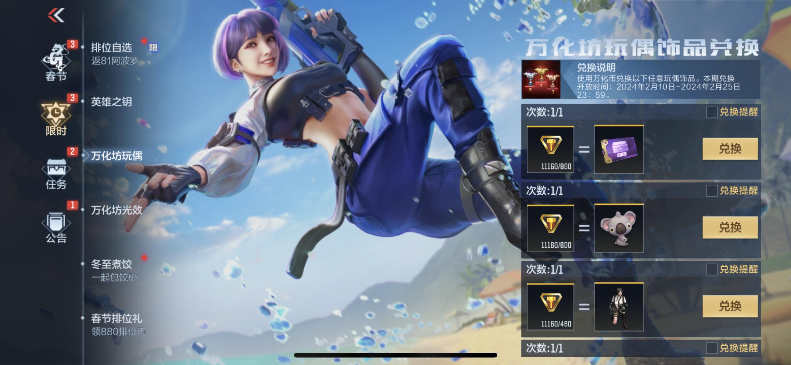 喜欢用巴雷特-毁灭的狙神可要注意啦,2月10日春节活动页签还会开启万化币兑换活动,不仅有全新终极品质光效巴雷特-毁灭-未来之星重磅首发,更有多款经典光效和趣味玩偶等你来获取。下面是本期万化币兑换的道具价格表,请大家自行预览。
