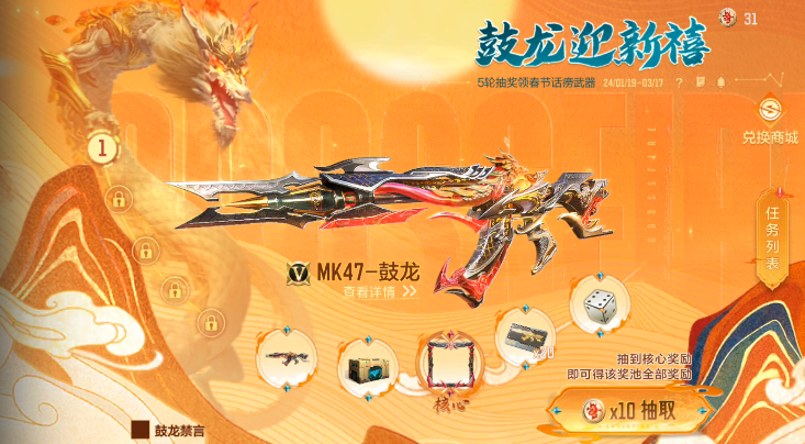 鼓龙迎新禧活动终于迎来了最后一轮打造,真的是超级开心,最后的奖池可以获得MK47-鼓龙觉醒石,大家手里的源·MK47-鼓龙终于可以觉醒成英雄级版本啦,除此之外还有海量鼓龙币登录即领,我们一起来分析下鼓龙迎新禧最后一轮都有哪些武器道具可以领取吧。