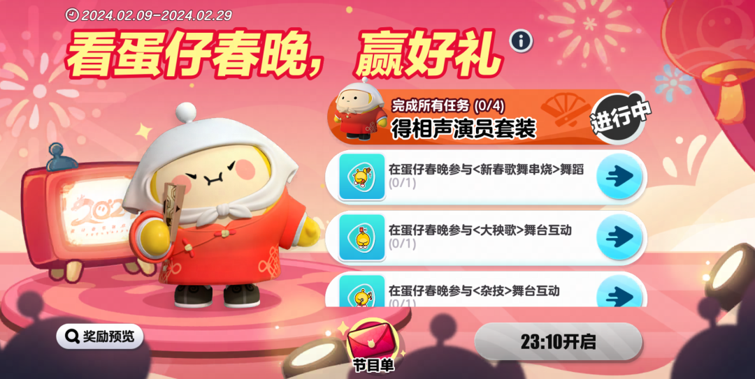看蛋仔春晚,赢好礼! 蛋仔们完成蛋仔春晚互动任务 即可解锁【相声套装】和4个迎春动作~ 更多惊喜红包雨等蛋来领!