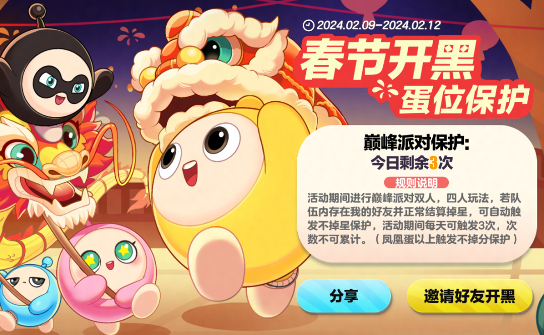 春节开黑放心飞,皮蛋保你不掉星 2月9日至2月12日 蛋仔们邀请蛋搭子一起开黑 巅峰派对双人、四人玩法 保你每天3次不掉分 皮蛋许你和蛋搭子快乐畅游巅峰派对!