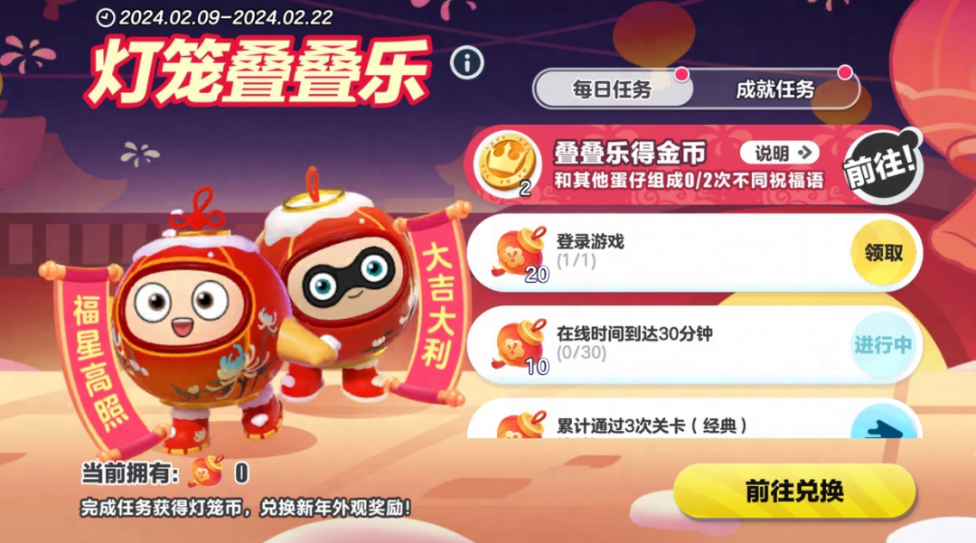 艳红灯笼高高挂,灯笼蛋贺词大赏! 2月9日至2月22日 蛋仔们完成每日任务和成就任务 领取对应数量的【小灯笼】 即可前往兑换商店兑换【灯笼自选盲盒】 22款灯笼外观任君挑选~ 今年,龙年特别上线“龙”“瑞”字!