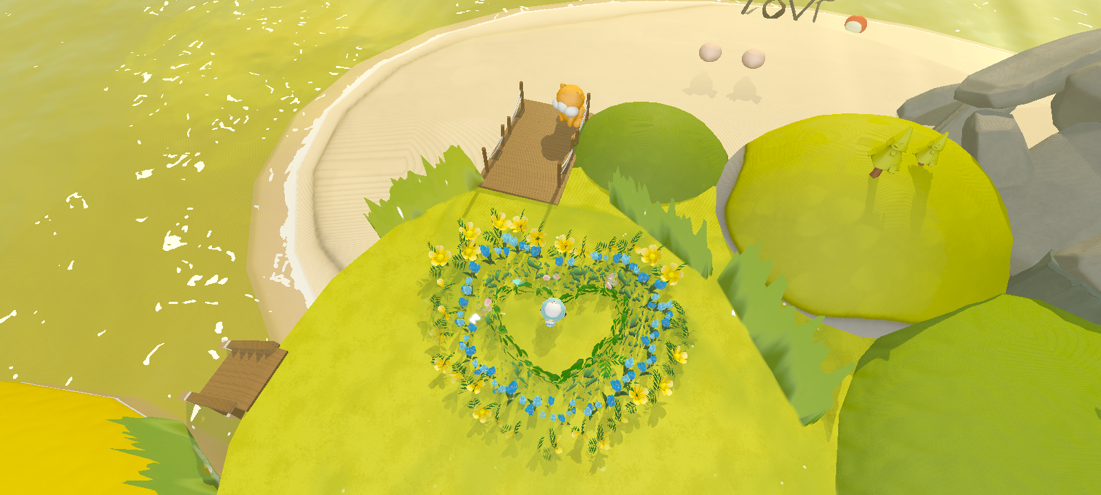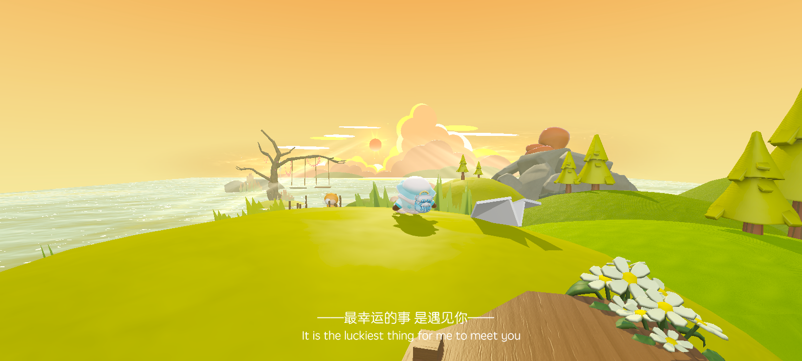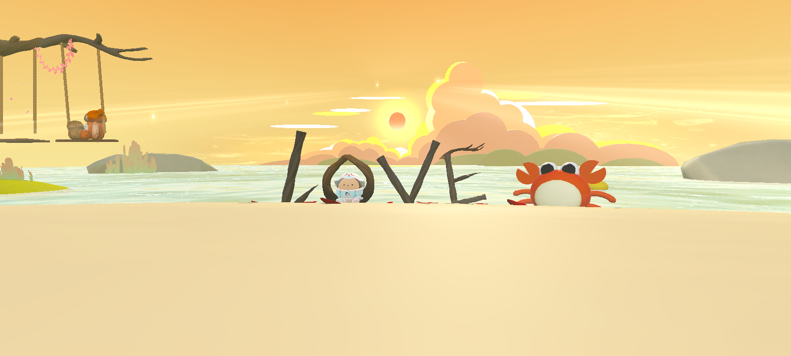 地图整体处在落日的海边,花围成的爱心,海边枯树上的秋千,沙滩上树枝摆成的LOVE!