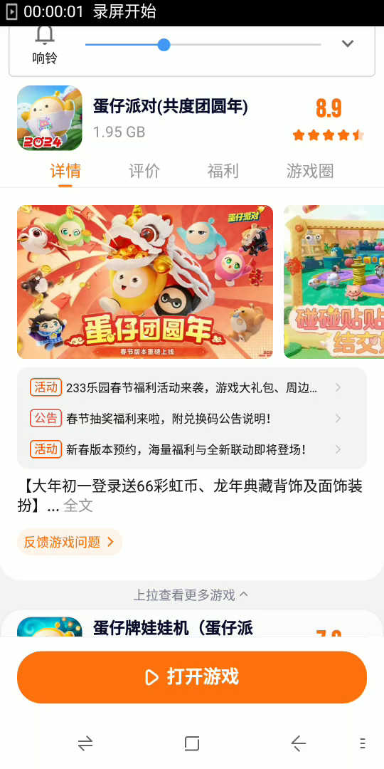 【大年初一登录送66彩虹币、龙年典藏背饰及面饰装扮】 233乐园联动皮肤专属兑换码:eggyeggy10au 【2月10日 《蛋仔派对》x《熊出没》联动开启,光头强棉袄外观免费送】 *<京华绮梦>国风盲盒上线,“千山绘灵青岚”、“神兽嘲风”、“御狸奴”亮相* *故宫观唐联动,完成任务送<九五蛋尊>装扮等好礼* *乐园同春过大年,送<小财神>外观套装* *龙龙送福红包雨,蛋仔岛小猪送礼活动开启!* 注意啦!你已进入盲盒世界,萌蛋来袭,派对开启!《蛋仔派对》是一款潮玩题材的休闲竞技手游,在这里你将化身Q萌蛋仔,加入热闹非凡的闯关派对。让我们一起撞走不开心,结交好碰友! 海量关卡,陷阱机关,争先恐后往前冲!奔跑、跳跃、翻滚,发生超真实的物理碰撞!百变外观任你搭配,潮流、酷炫、萌趣的盲盒等你收入囊中!更有零门槛地图编辑器,DIY你的专属关卡!