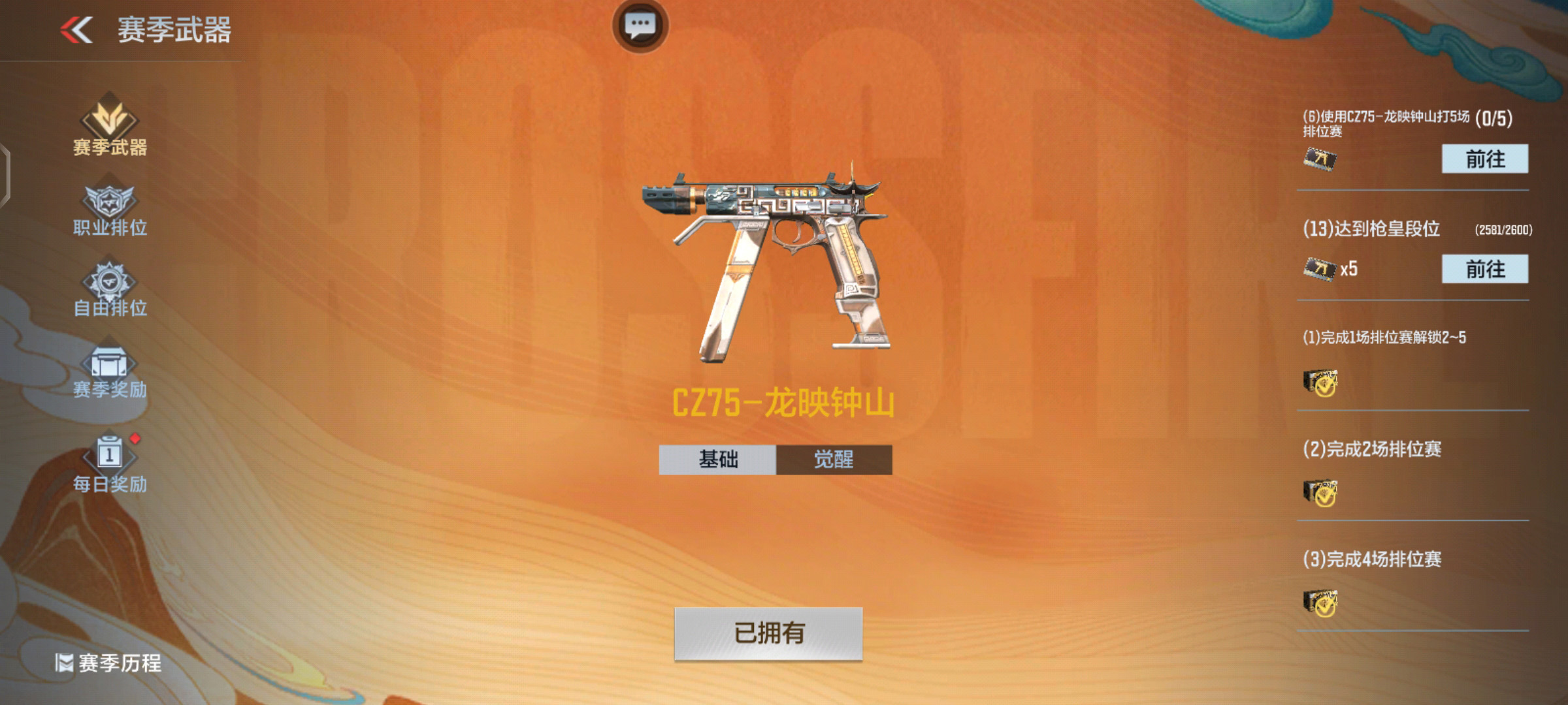 与2023年排位武器比较类似,CZ75-龙映钟山可以通过觉醒石进行觉醒。觉醒石可以通过完成赛季任务或者开启排位宝箱获取。集齐100枚觉醒石就可以觉醒为CZ75-龙映钟山觉醒。