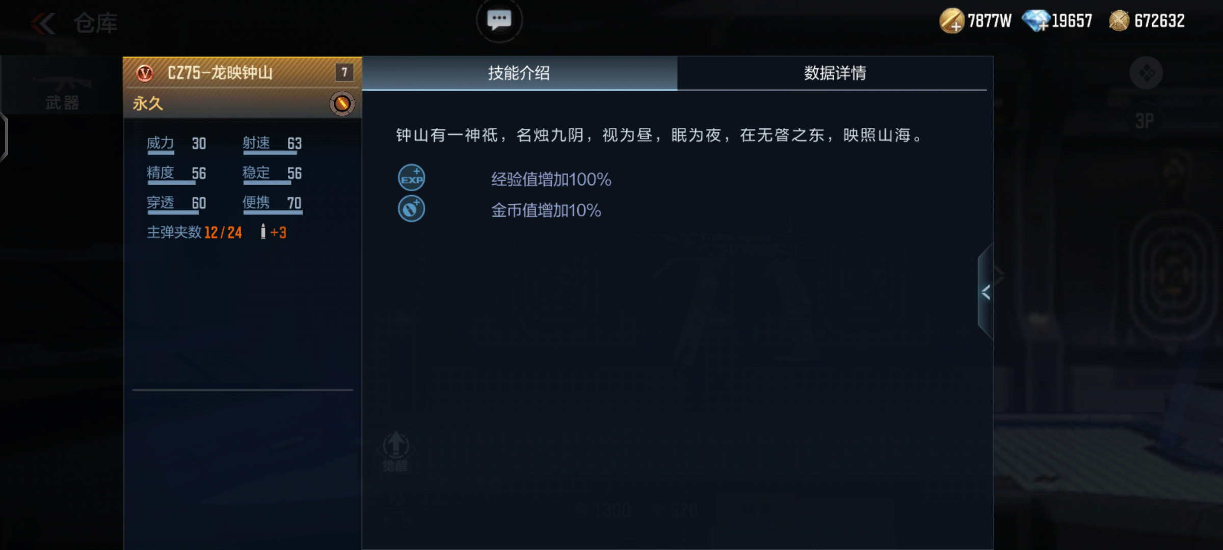 由于CZ75-龙映钟山为初始形态,因此其仅有常规的经验值增加100%以及金币值增加10%这两项属性技能。