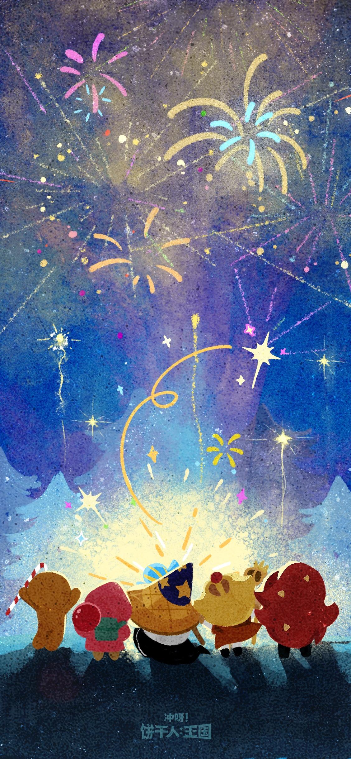 魔法师饼干抬起魔杖,一束束烟花在空中绽放;
