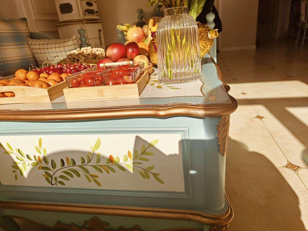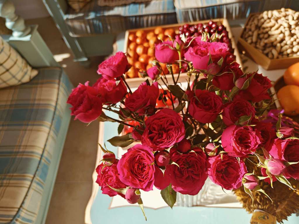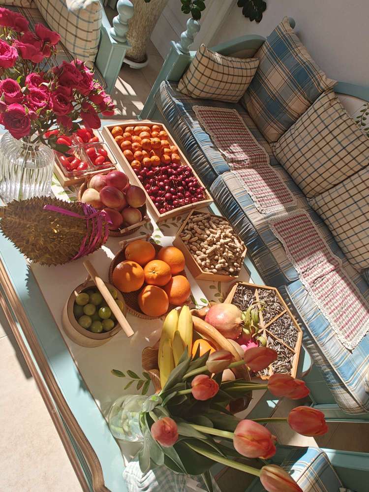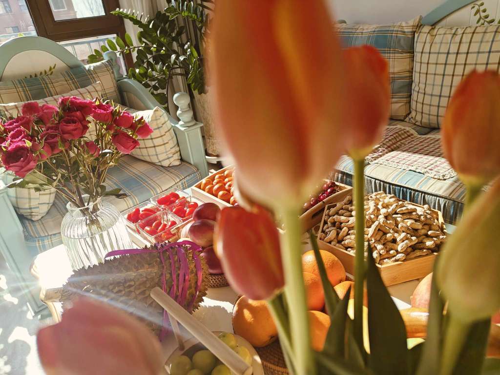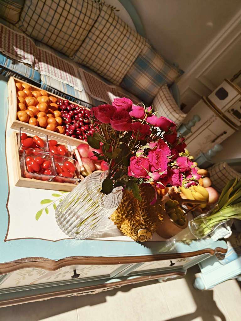 来大姑家了,大姑摆的水果和小花