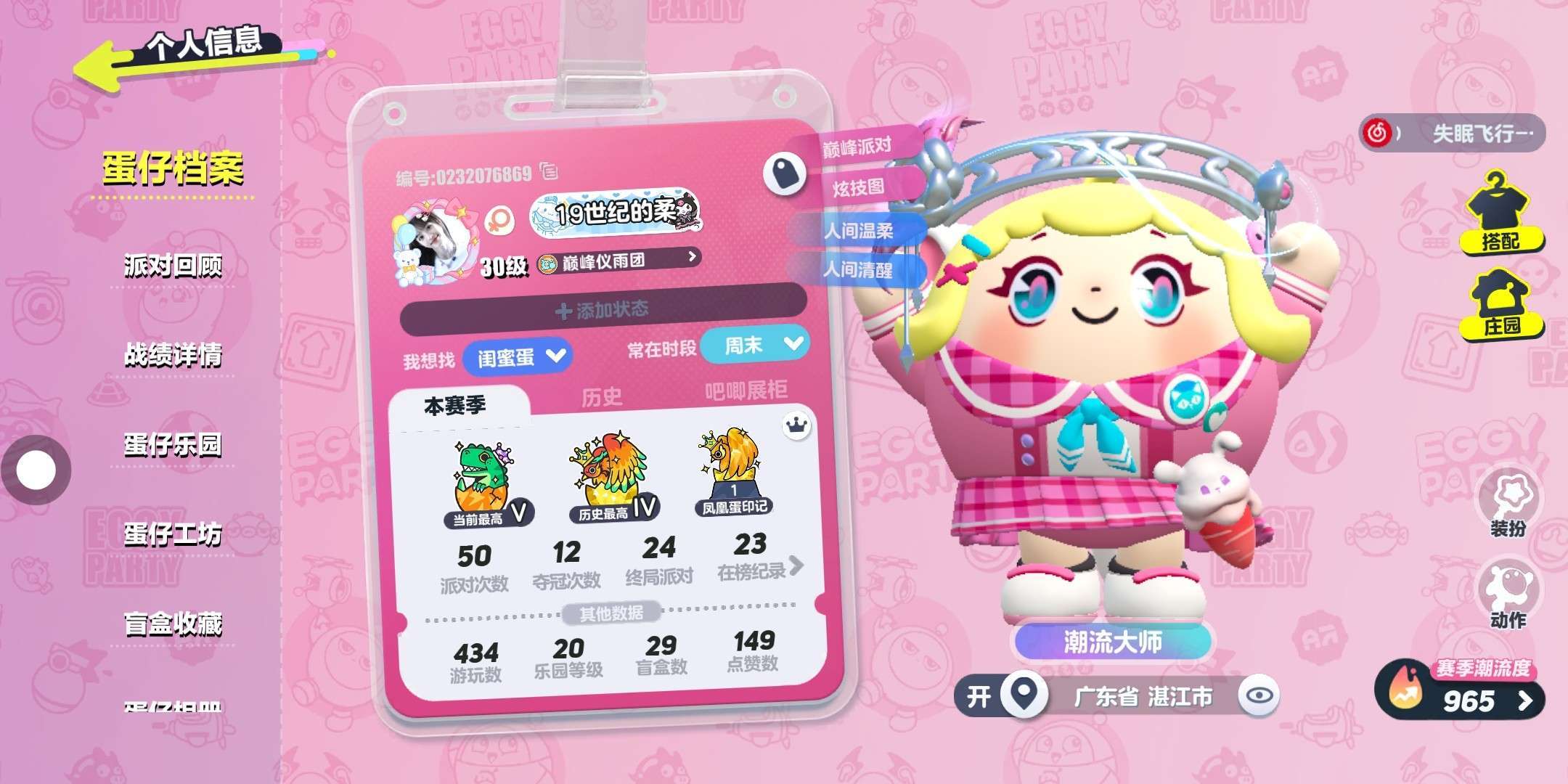 寻找蛋搭子😝10~15☺要求:鸵鸟蛋以上,必须得有三个紫皮(纤维买的紫皮)😴比如:仓鼠米仔,淘气丸子,仔仔熊),总潮流度要过2000😇嫌要求高的可以不来😪如果你想来做我的蛋搭子,就在我这贴下发出你的蛋仔主页,我看到我就会去加或你去加我😊