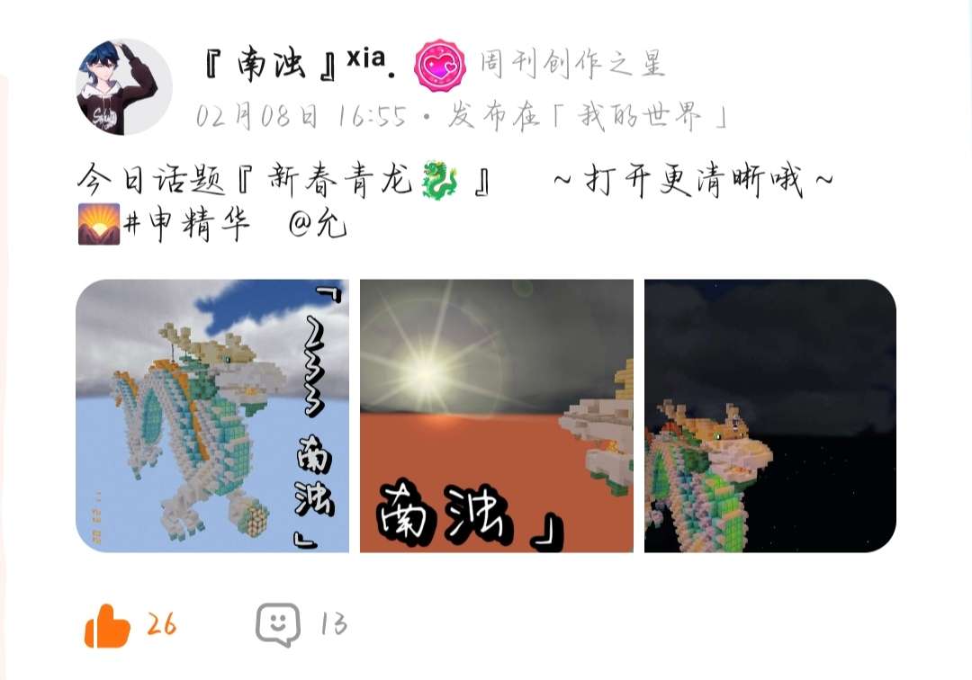 🧨²⁰²⁴/平安喜樂—大家好呀,我是阿允,欢迎大家收看【MC周刊】第12期🌈新年的第一期周刊🐑❤️🏮龙年快乐,祝大家龙行龘龘,前程朤朤❗◎一切皆有所望 一切皆有所期.👀来看看这一期你有没有上榜吧🌚❤上正题🌿(温馨提示:不能连续上两次周刊哦❗❗)