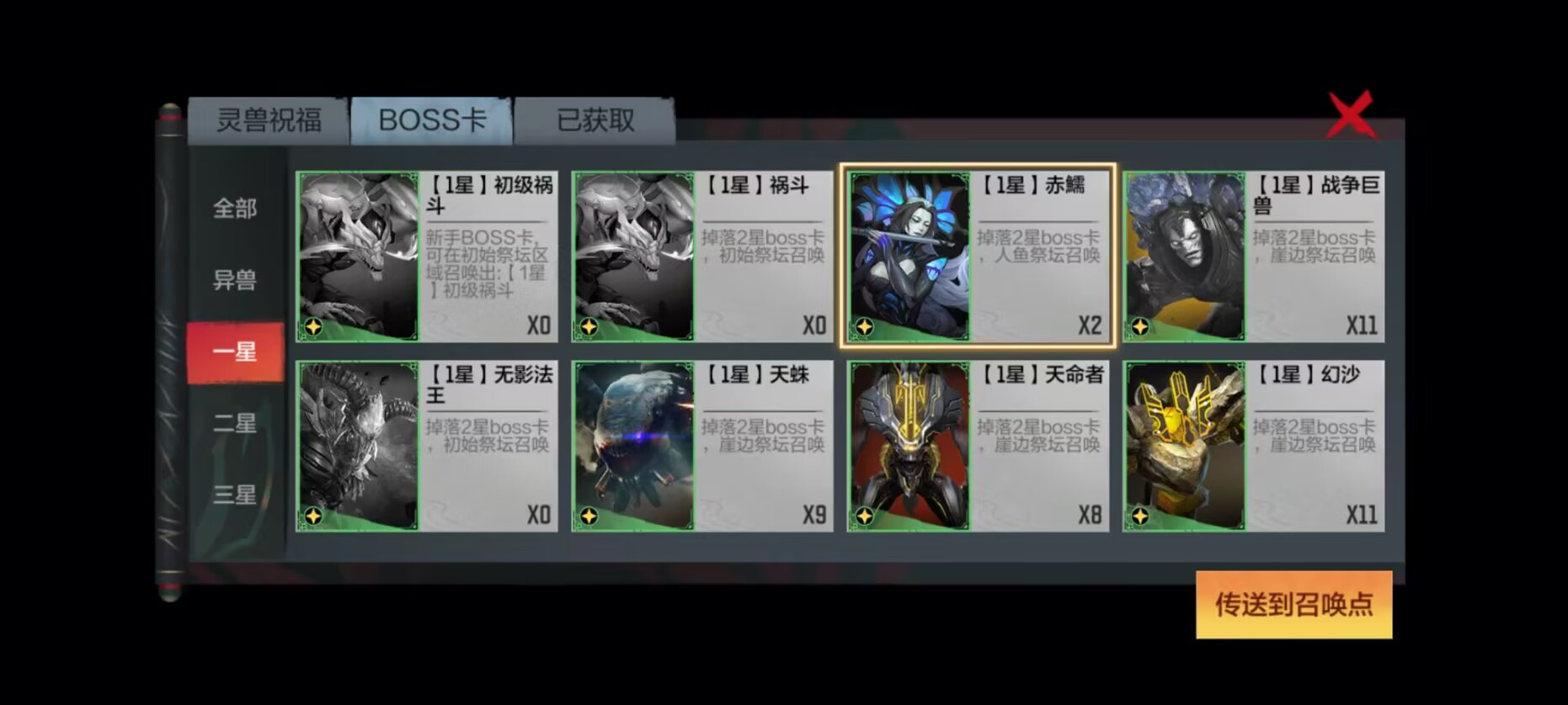 实际选择的时候只能选择你拥有的BOSS卡,可以传送到对应BOSS的BOSS房间内,并且是直接传送到BOSS房五色石召唤法器旁边,随后直接点击召唤即可。