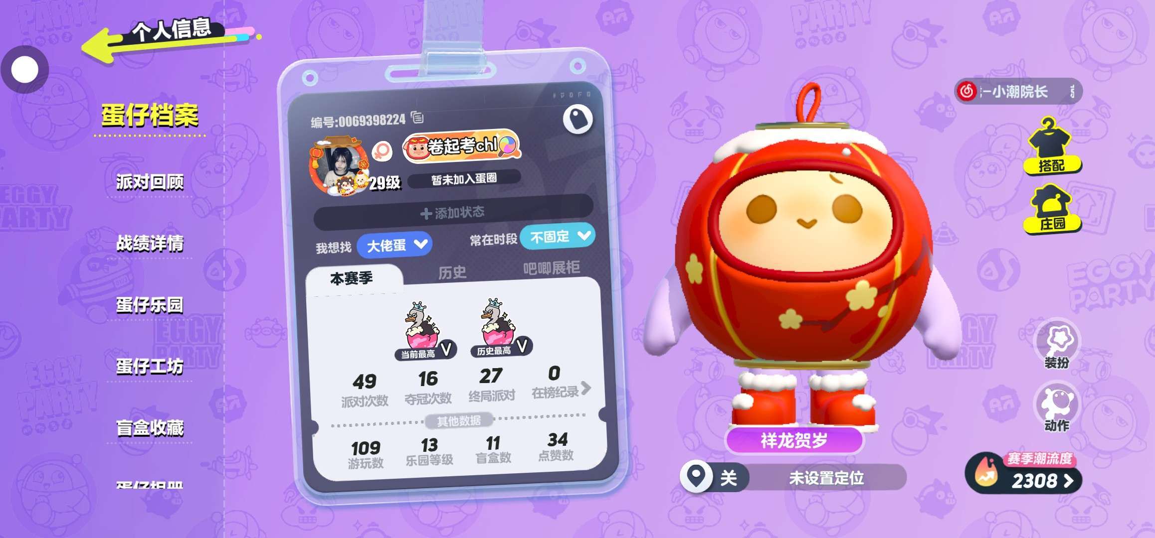 名字:卷起考chl,头像下面↓,段位:鸵鸟蛋,29级,有四个皮肤,我想找大佬蛋,常在时段不固定,赛季潮流度2308,派对次数49,夺冠次数16,终极派对27,在榜记0,游玩次数109,乐园等级13,盲盒数11,点赞数34,本蛋仔很详细的讲了我的号,必须来加我