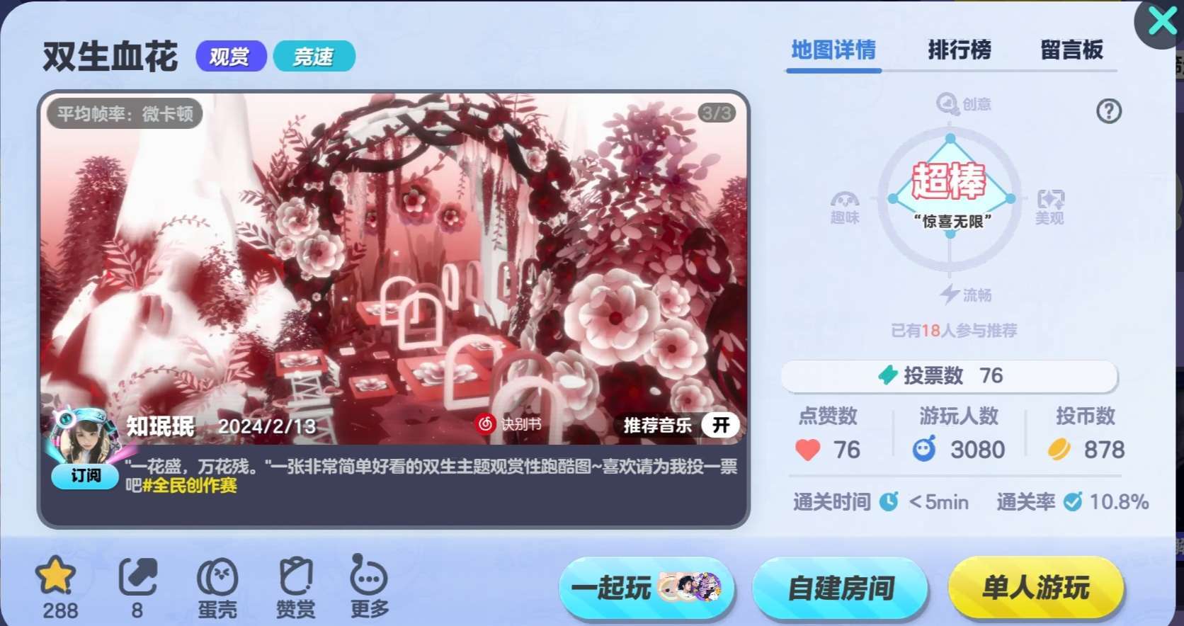 不知为何🧐知珉珉大大的每一张地图都很绝美,关卡设置也并不单调💮可是就是不火🔥希望家人们多去玩一玩大大的地图,希望作者大大以后蒸蒸日上‼️