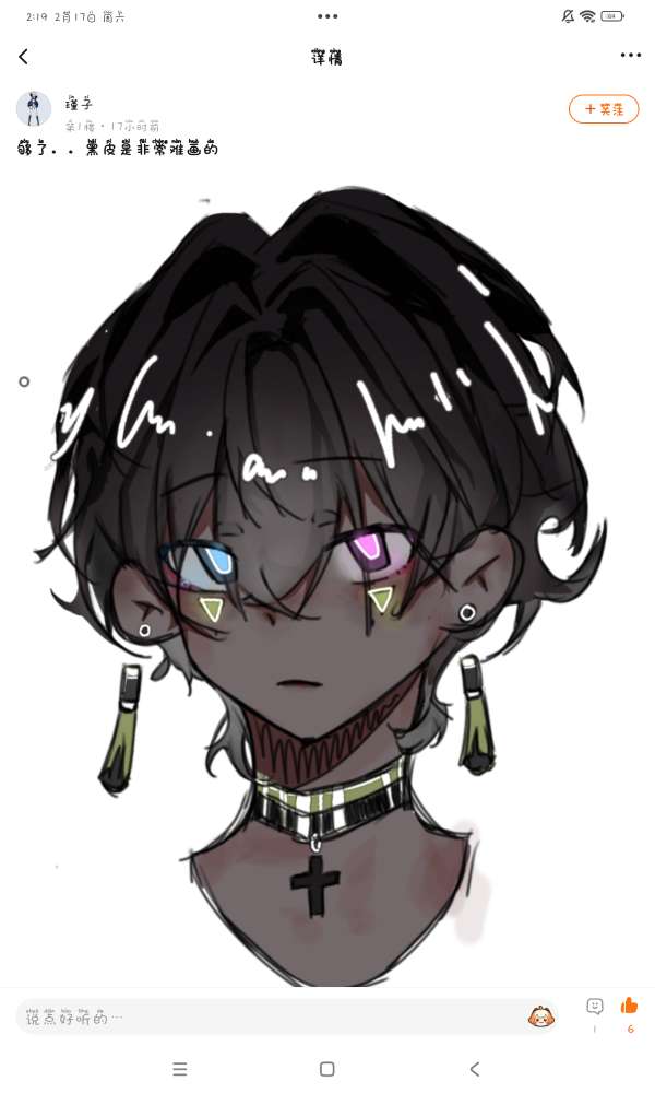 主编点评:很酷的男孩子!太太的画风特别的漂亮(✧∇✧) 仅仅是大头细节却依旧不少!头发有特别好看的质感✨ 配色很养眼舒服‼️ 虽然是黑色皮肤却有很干净的感觉 异色眼睛给画作增色不少!
