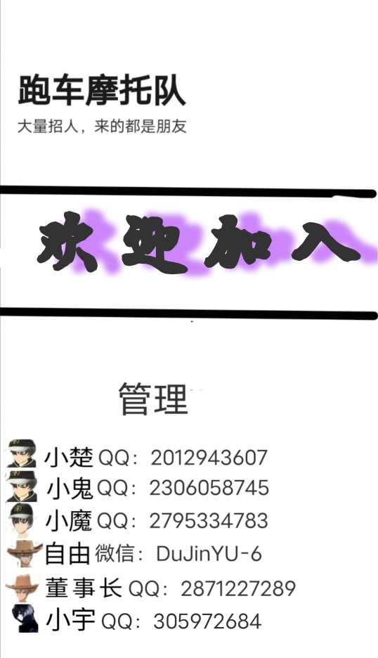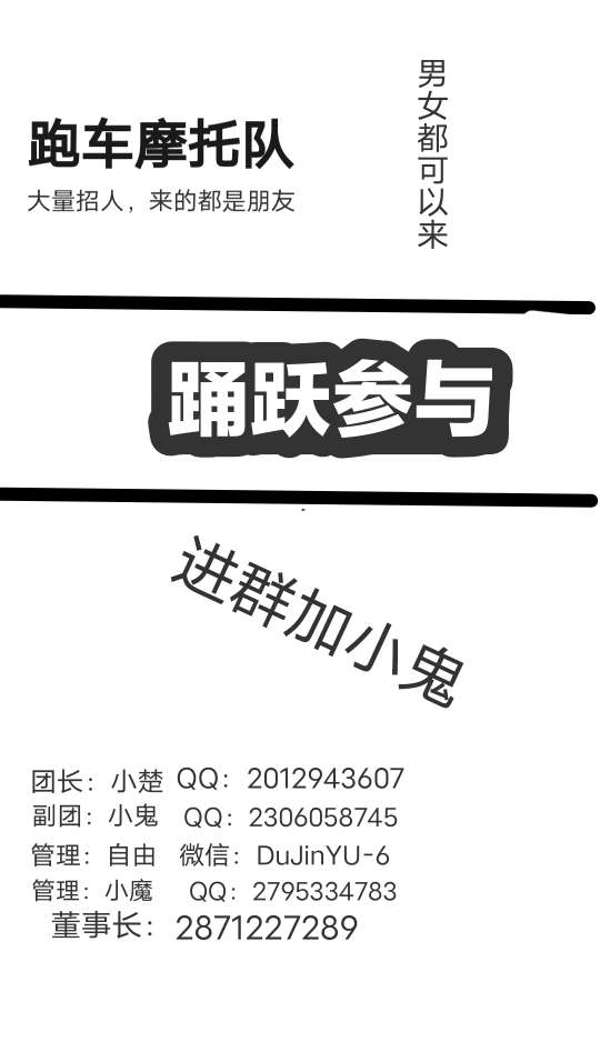 欢迎,有跑车有摩托的都可以加入,加小鬼