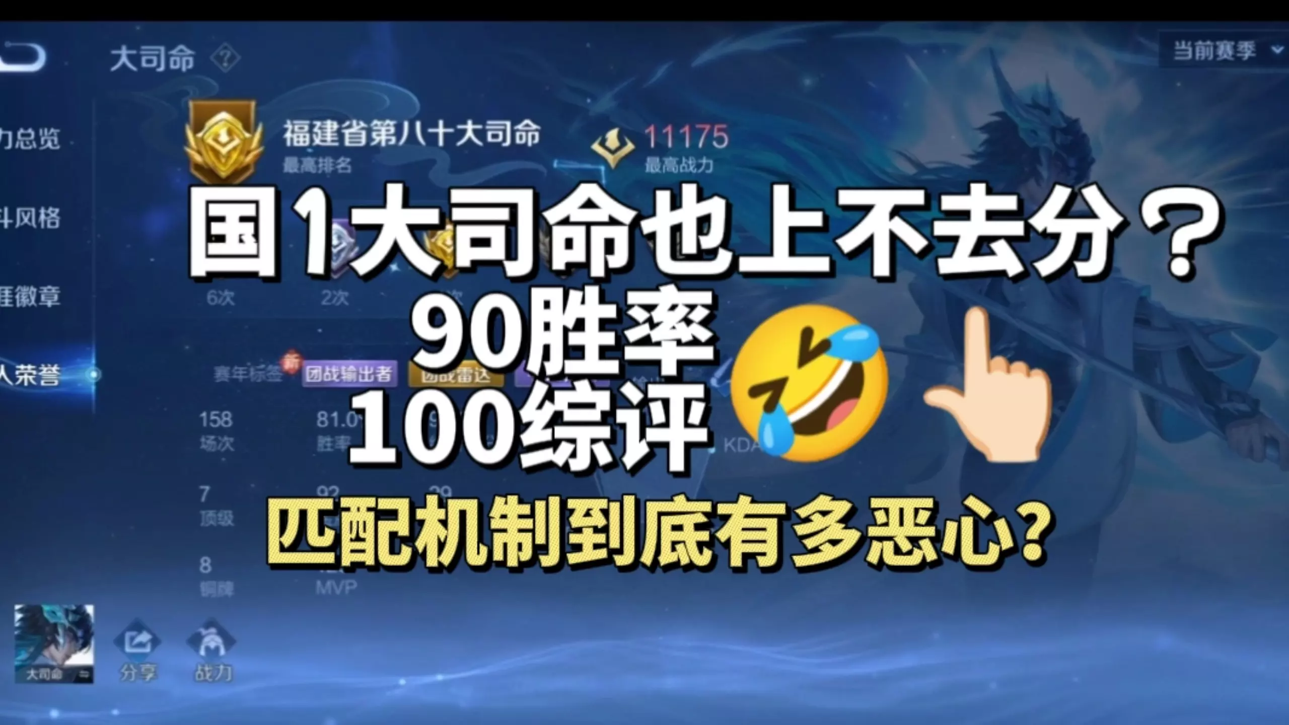 王者荣耀 匹配机制到底有多恶心?90胜率 100综评 国1大司命来了也上不去分,排的队友到底是什么样的?