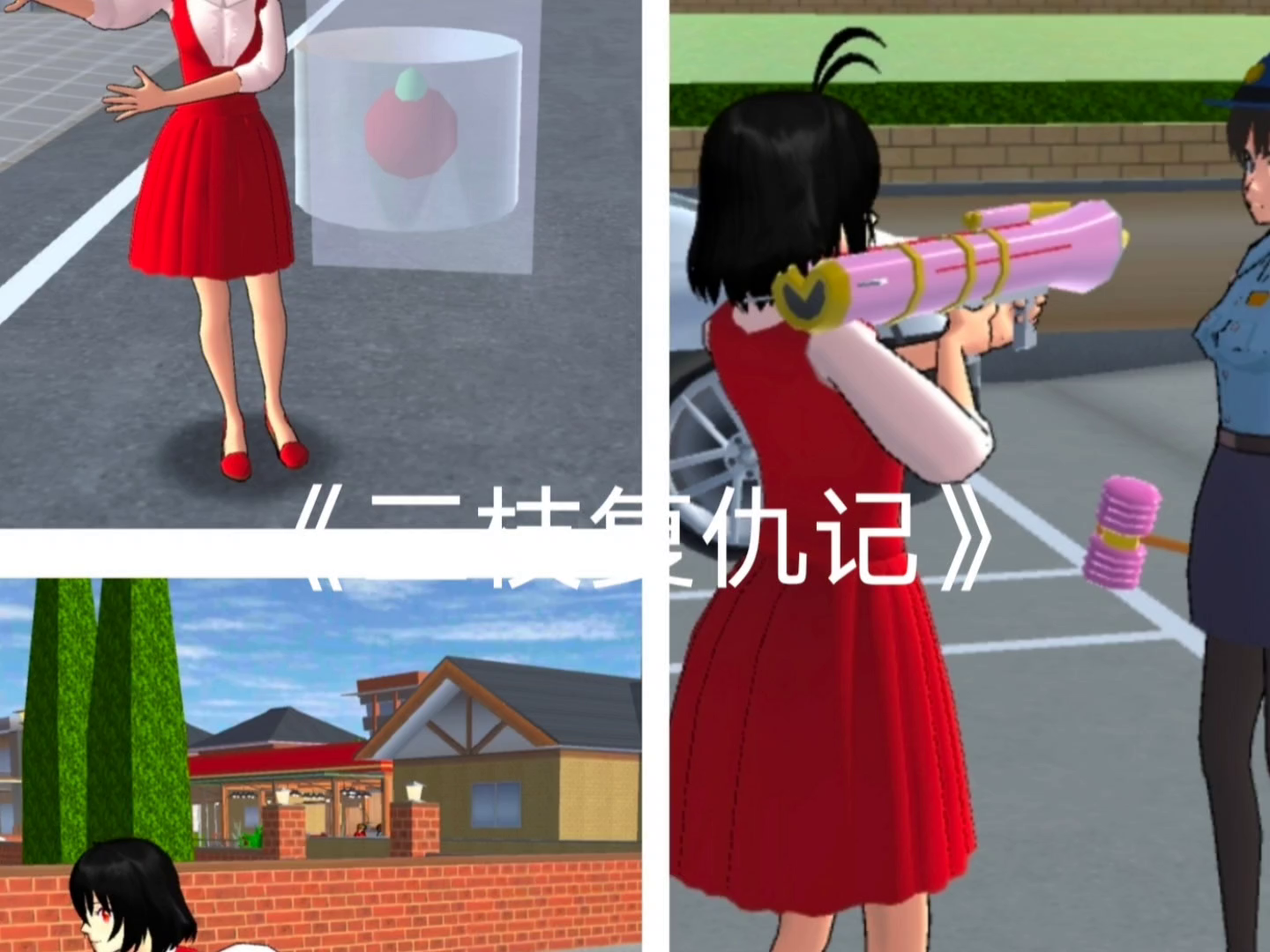 这是《三枝复仇记》第一期内容,在樱花校园模拟器的场景中,角色七奈发起“打三枝”的挑战,呈现了三枝被打倒在地的情节,同时展示了三枝复仇相关的剧情画面。