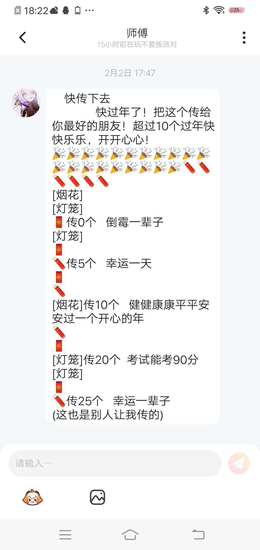我师傅发给我的已经过完年了,我才看到喽,师傅给我回的是,过了好久了