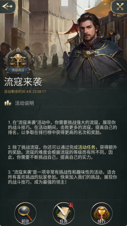开服第一天,游戏内将开启流寇来袭活动,持续5天。