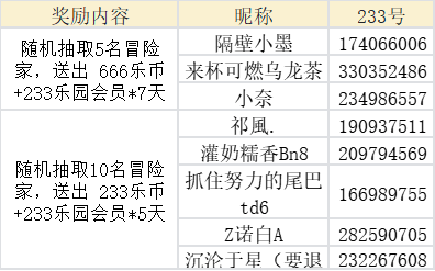 随机抽取10名冒险家,送出 233乐币+233乐园会员*5天