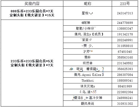 随机抽取1名萤火虫,送出 888乐币+233乐园会员*7天+定制头衔【萤火谜圣】*15天