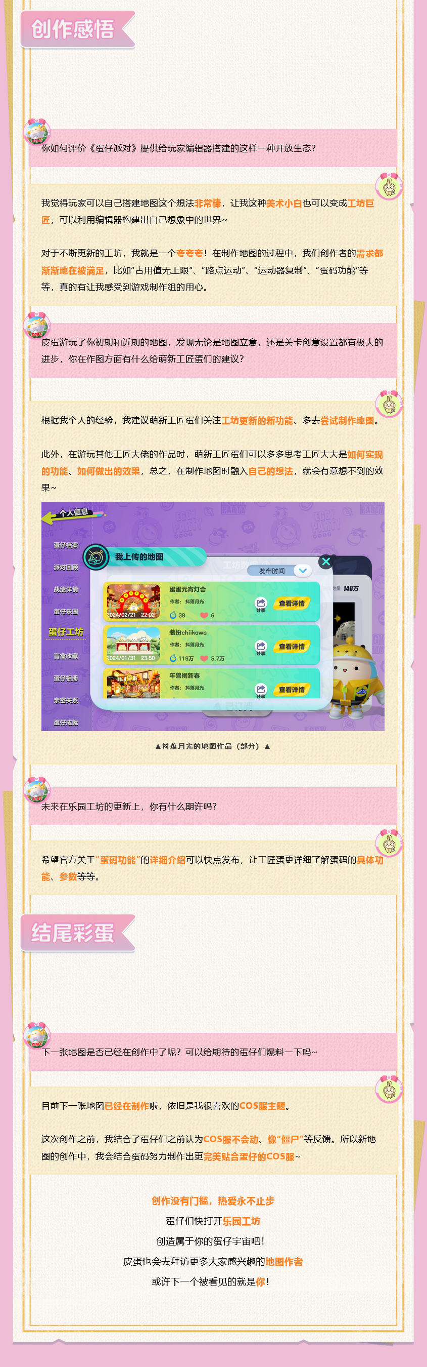 穿戴私人定制的COS皮肤 行过熙攘闹市和瓜果农田 与蛋搭子拍一条沉浸式eggy's vlog 打卡完震撼华美的端午游龙 就向着危机四伏的原始草原深处进发 她地图中的碧瓦飞檐、幽幽丛林无比生动 其代表作《在蛋仔来场COS吧》一经面世 更是让数万蛋仔慕名前来打卡当当当! 她就是本期明星工匠的采访嘉宾—— 抖落月光 快来和皮蛋一起了解其地图创作的历程吧!