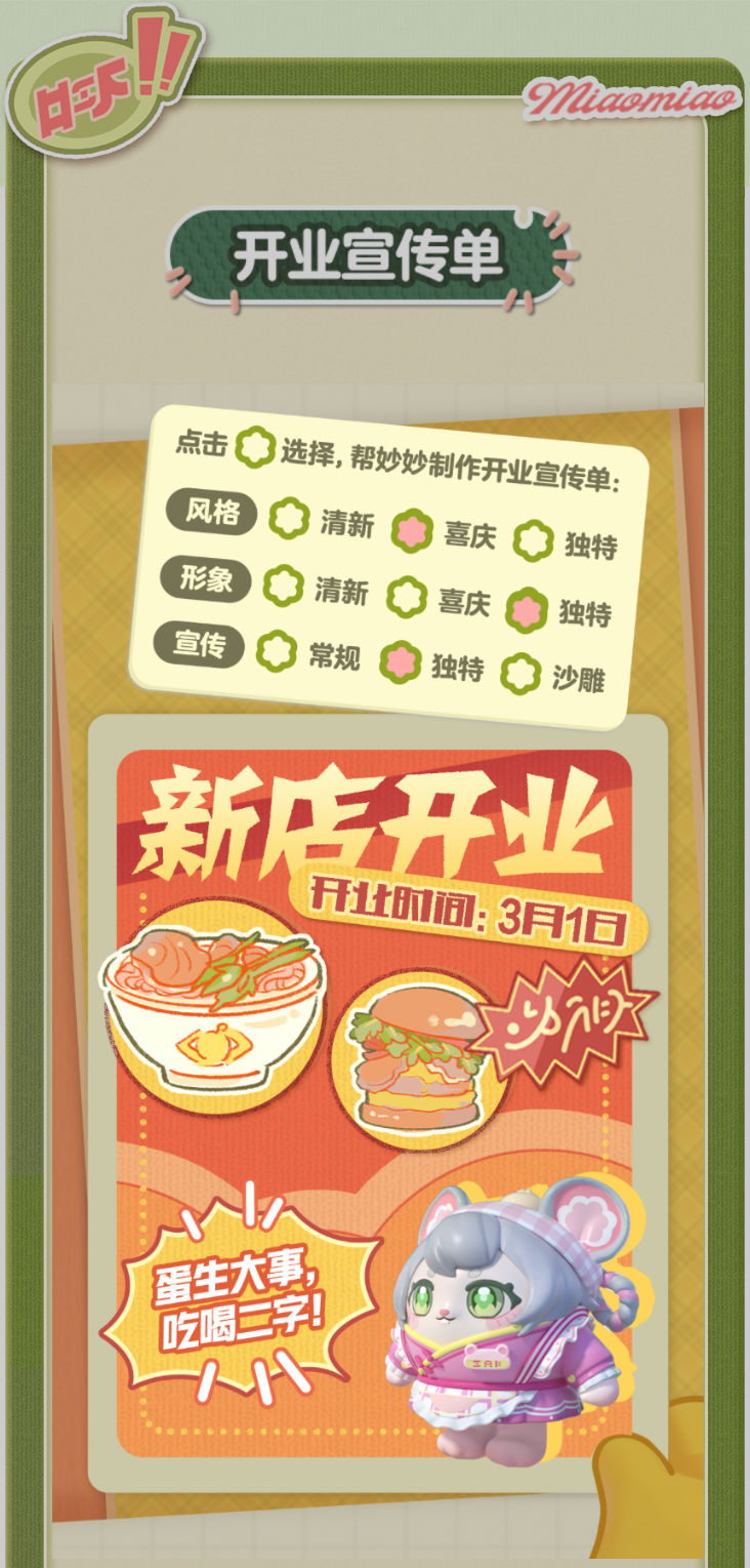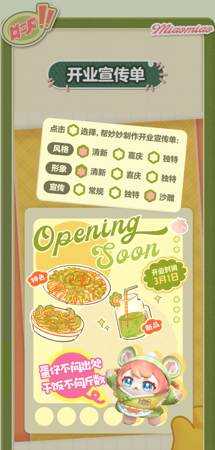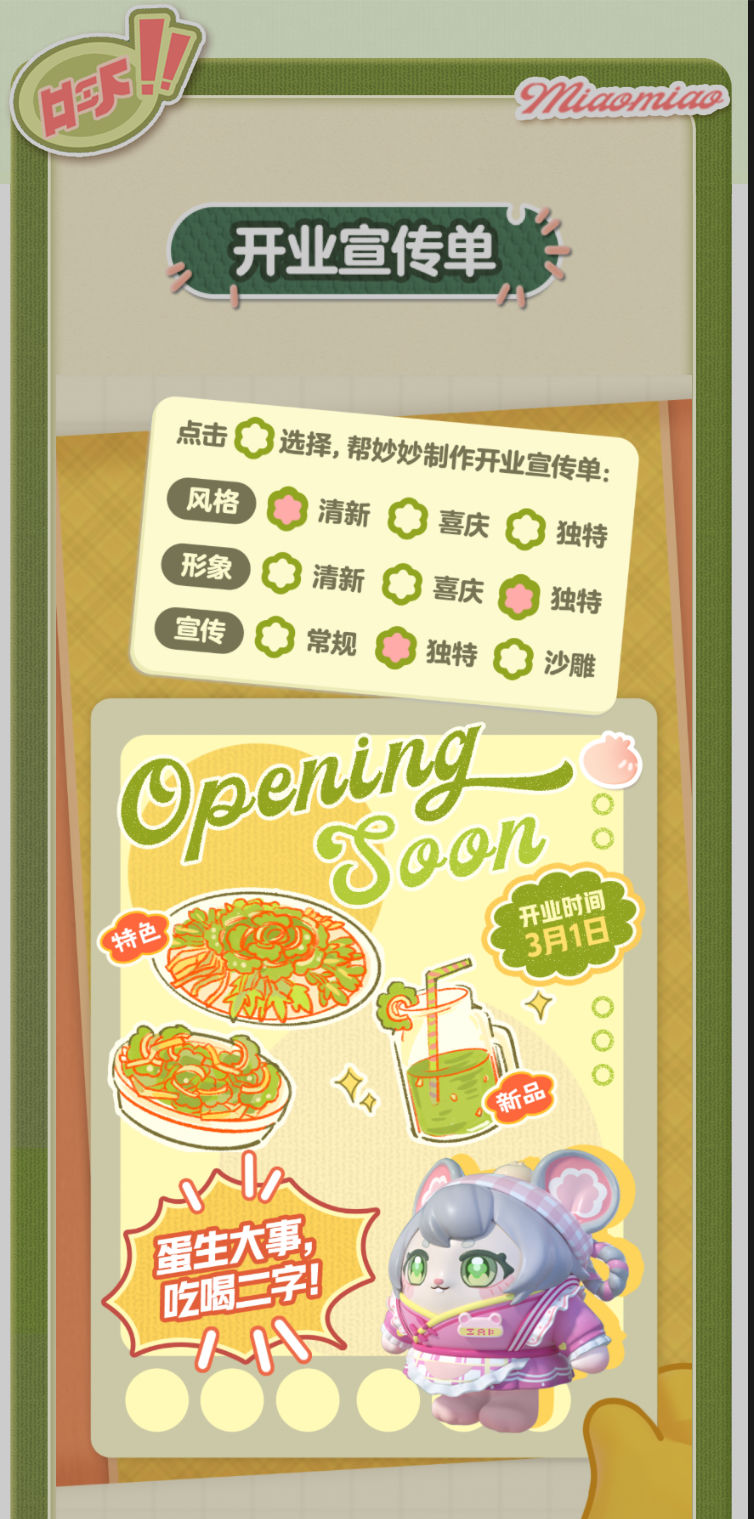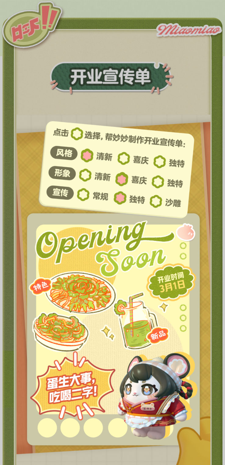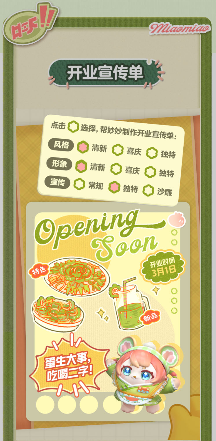 妙妙的店铺筹备将至尾声 蛋仔创业未半却中道歇停 妙妙苦恼的原因竟是 如何定制一张嗨爆全岛的宣传单?! AAA金牌打菜师妙姐(全年无休)在线发出征集 寻觅能完美catch流量密码和 提升店铺人气的“神蛋” 帮助她定制能提升人气的开业宣传单 再三考虑后,妙妙决定将这个难题交给 洋溢着智慧气息和艺术细菌的蛋仔你! 快来帮助妙妙制作一张完美开业宣传单吧!