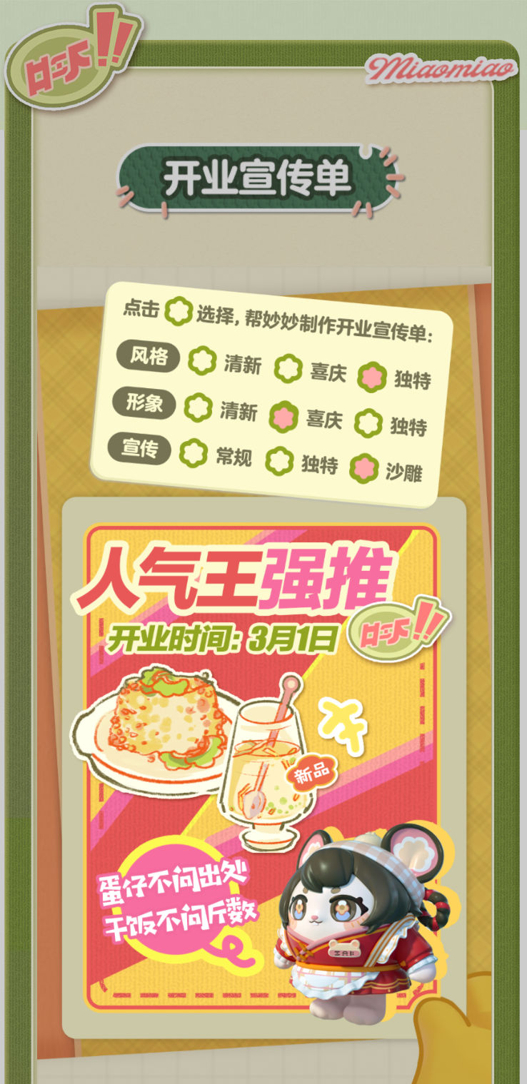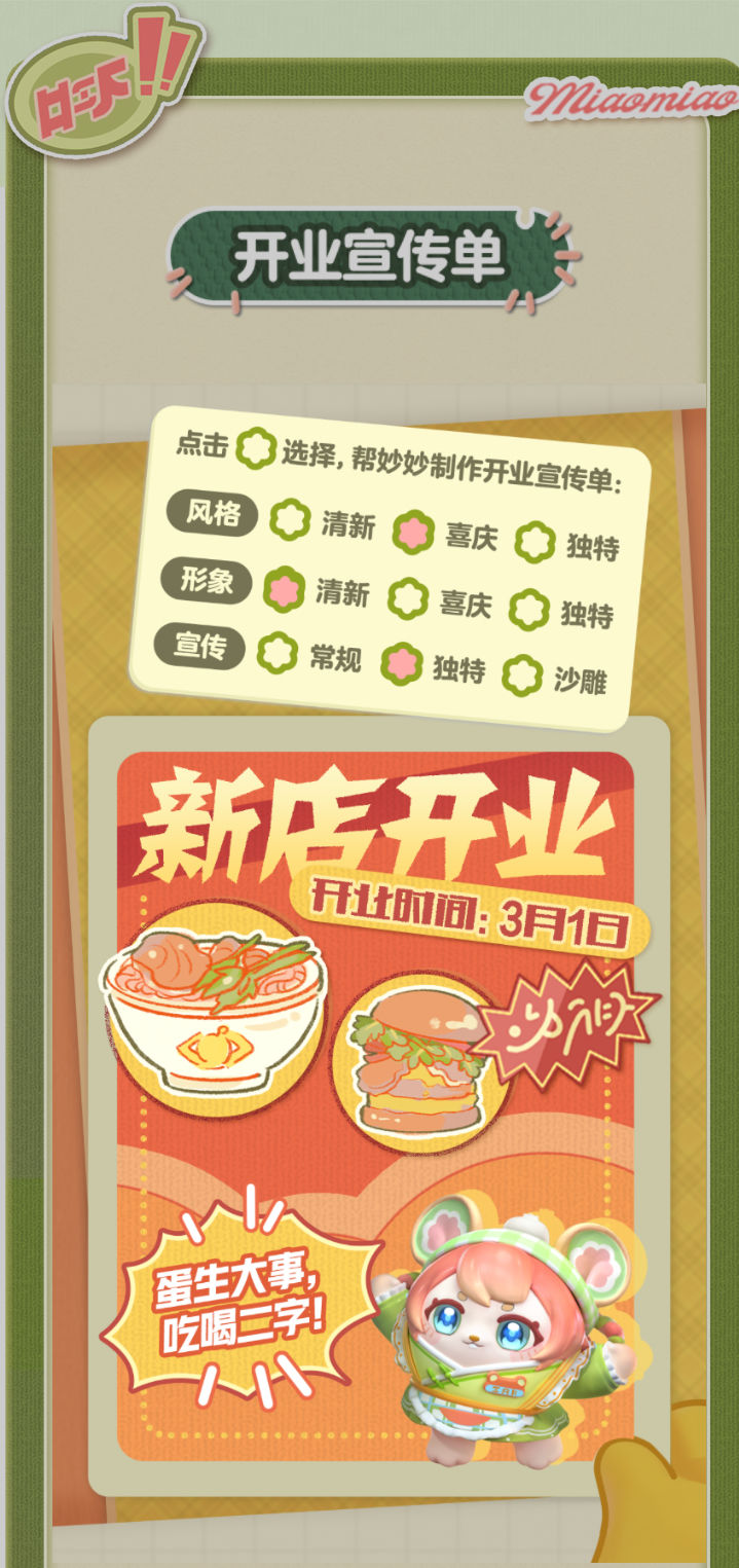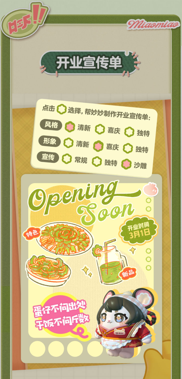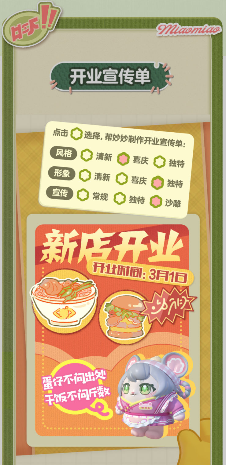 妙妙的店铺筹备将至尾声 蛋仔创业未半却中道歇停 妙妙苦恼的原因竟是 如何定制一张嗨爆全岛的宣传单?! AAA金牌打菜师妙姐(全年无休)在线发出征集 寻觅能完美catch流量密码和 提升店铺人气的“神蛋” 帮助她定制能提升人气的开业宣传单 再三考虑后,妙妙决定将这个难题交给 洋溢着智慧气息和艺术细菌的蛋仔你! 快来帮助妙妙制作一张完美开业宣传单吧!