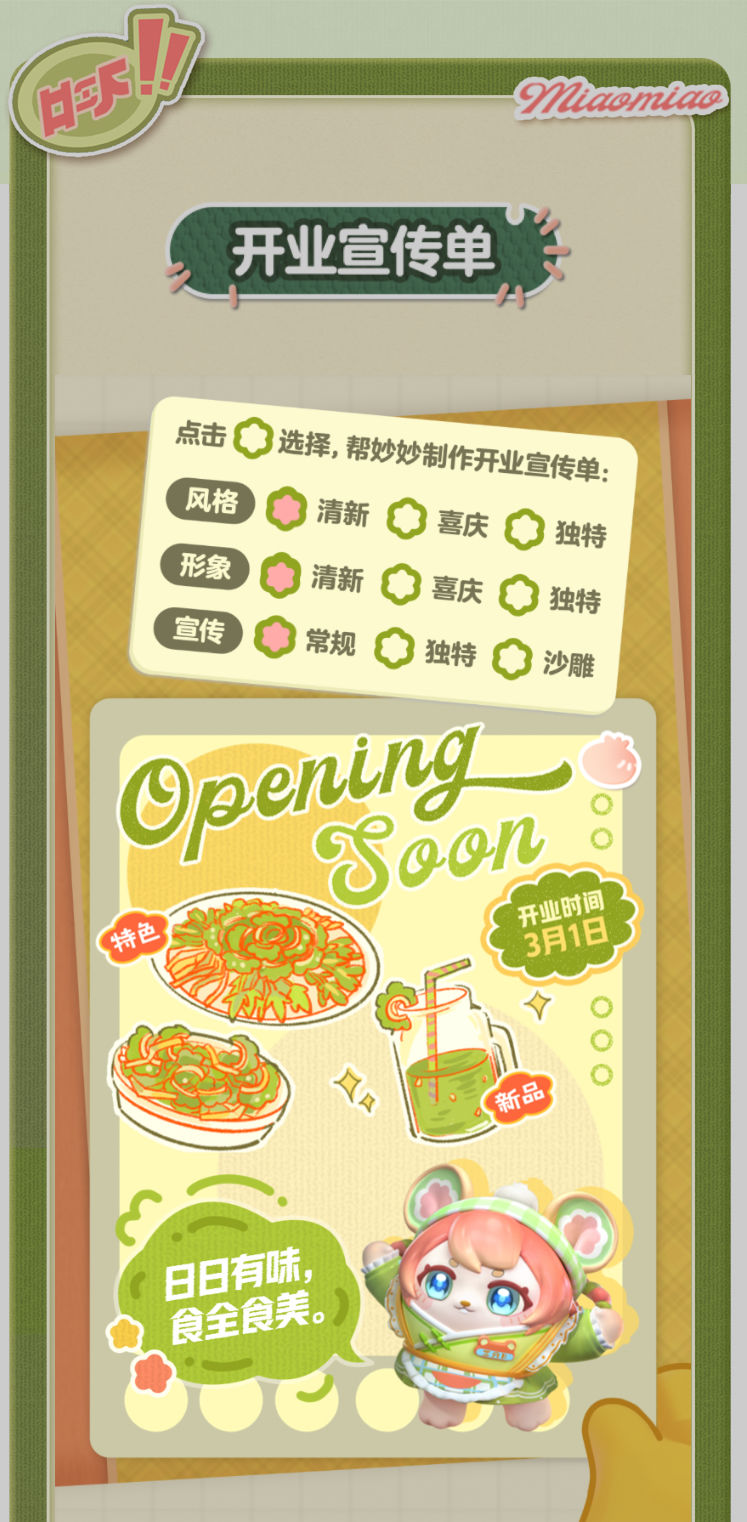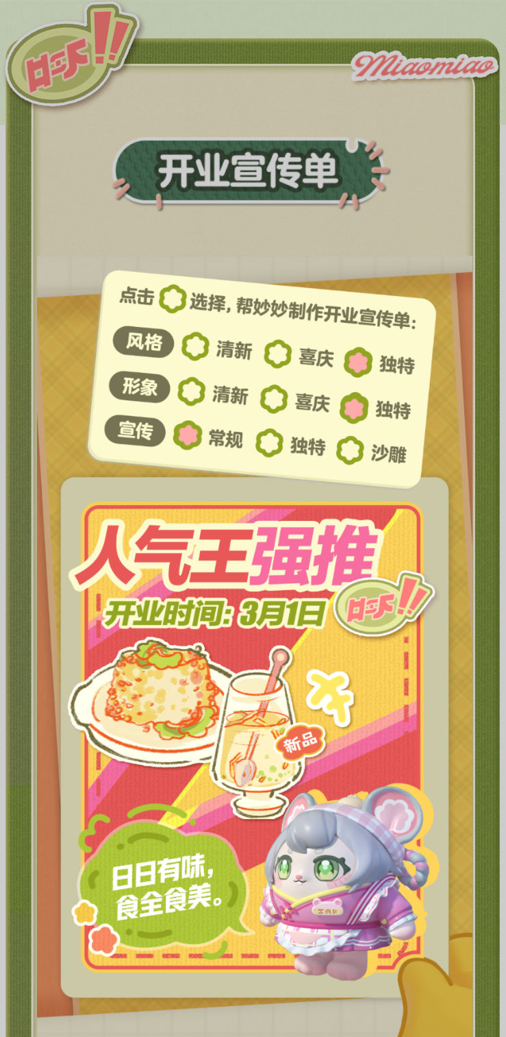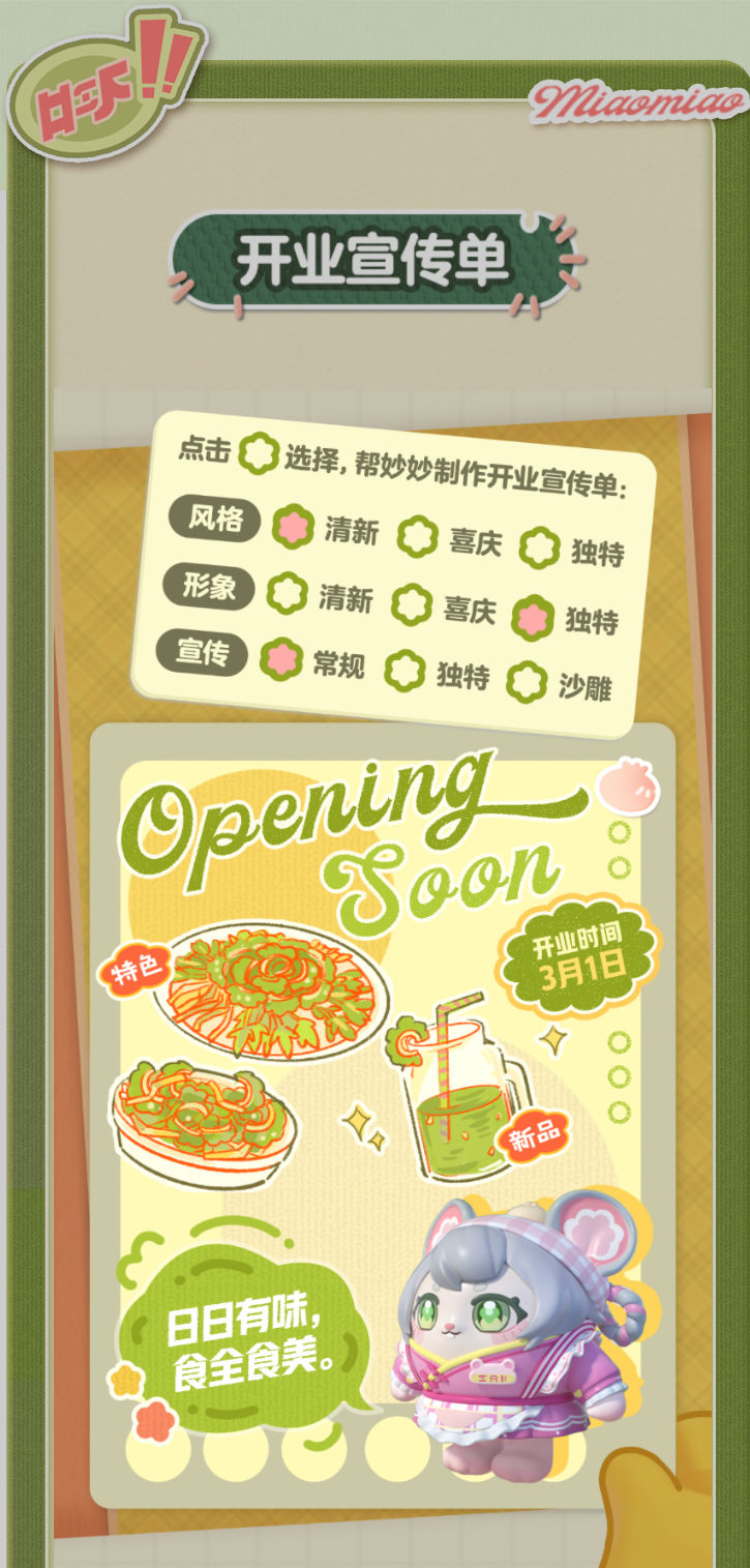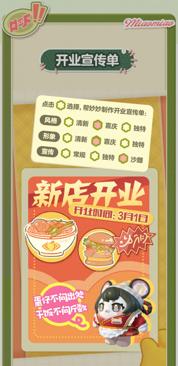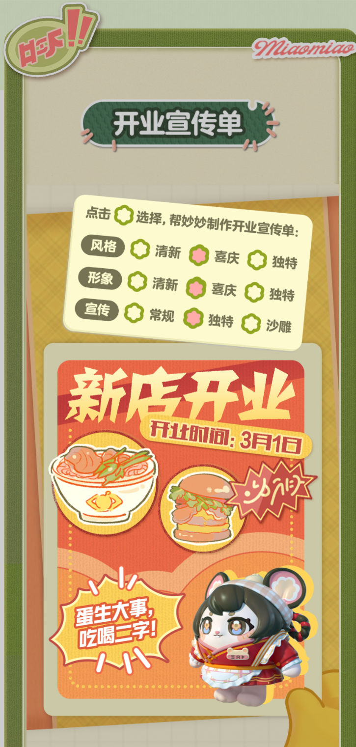 妙妙的店铺筹备将至尾声 蛋仔创业未半却中道歇停 妙妙苦恼的原因竟是 如何定制一张嗨爆全岛的宣传单?! AAA金牌打菜师妙姐(全年无休)在线发出征集 寻觅能完美catch流量密码和 提升店铺人气的“神蛋” 帮助她定制能提升人气的开业宣传单 再三考虑后,妙妙决定将这个难题交给 洋溢着智慧气息和艺术细菌的蛋仔你! 快来帮助妙妙制作一张完美开业宣传单吧!