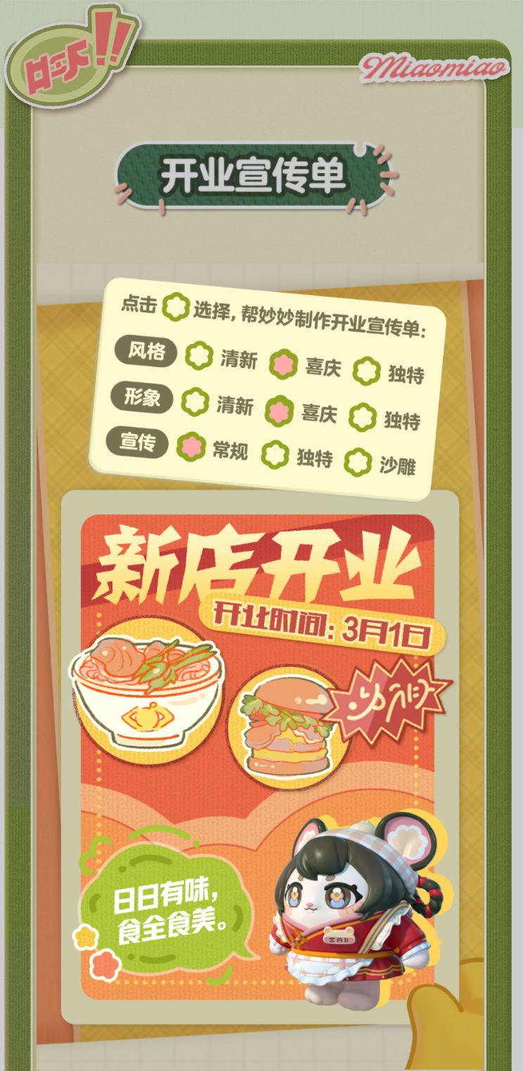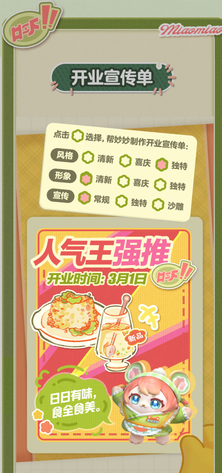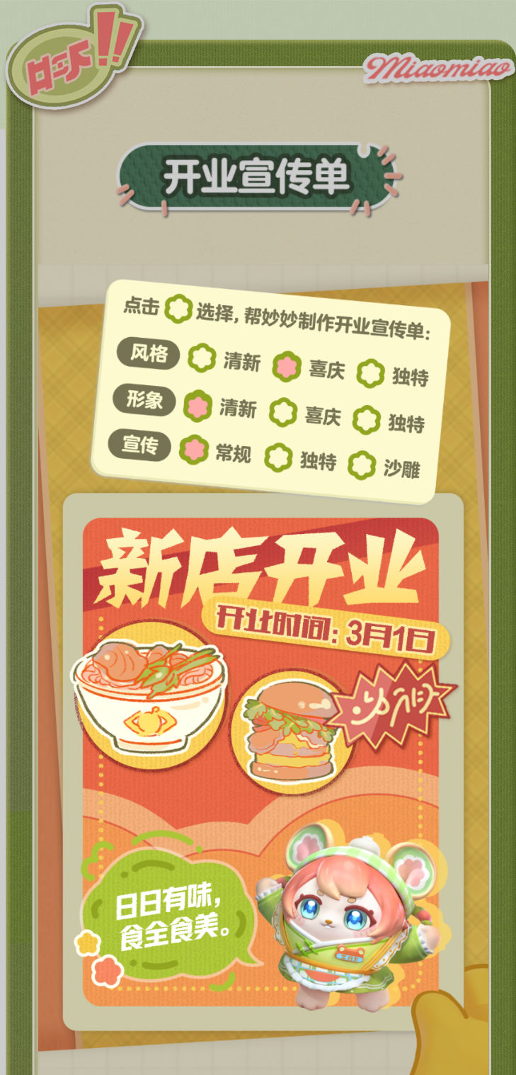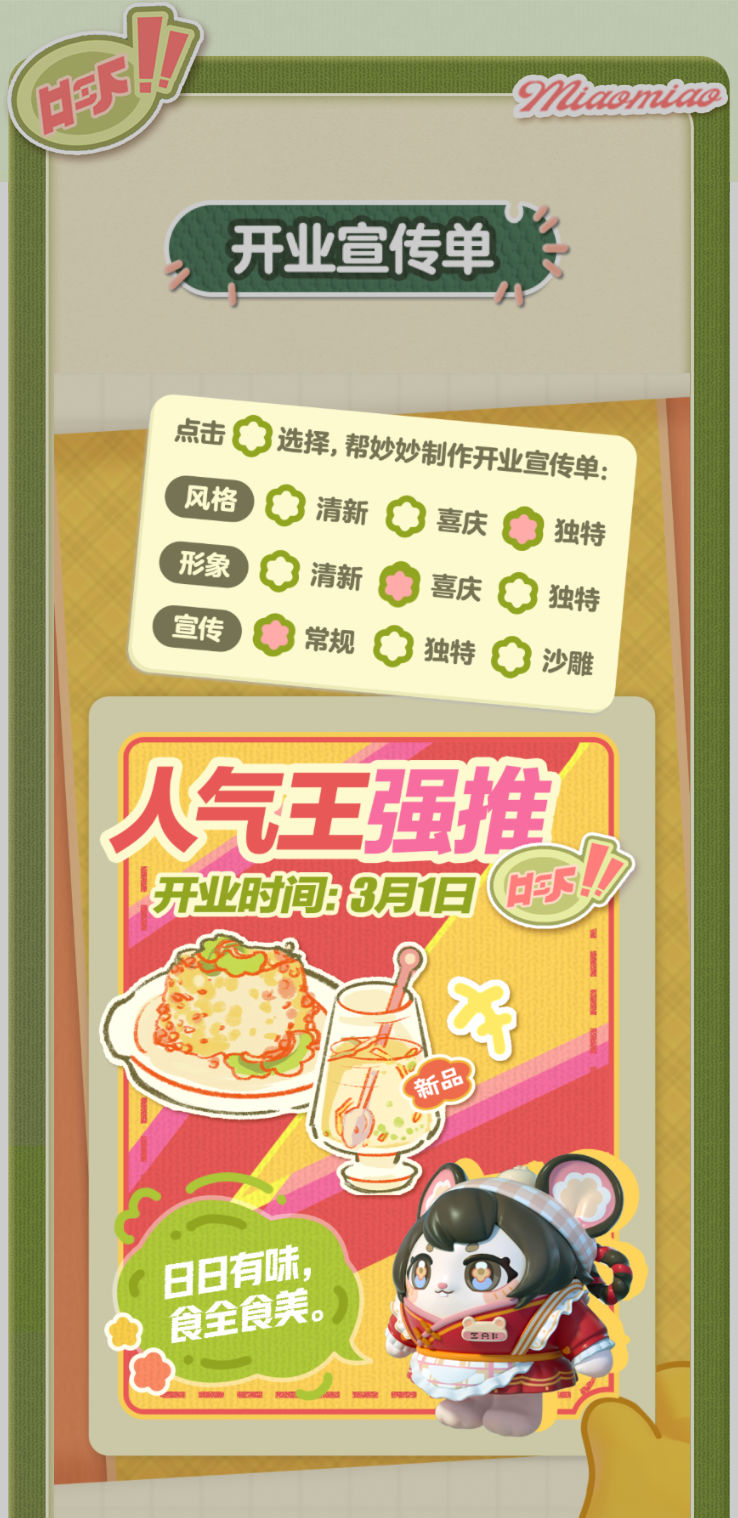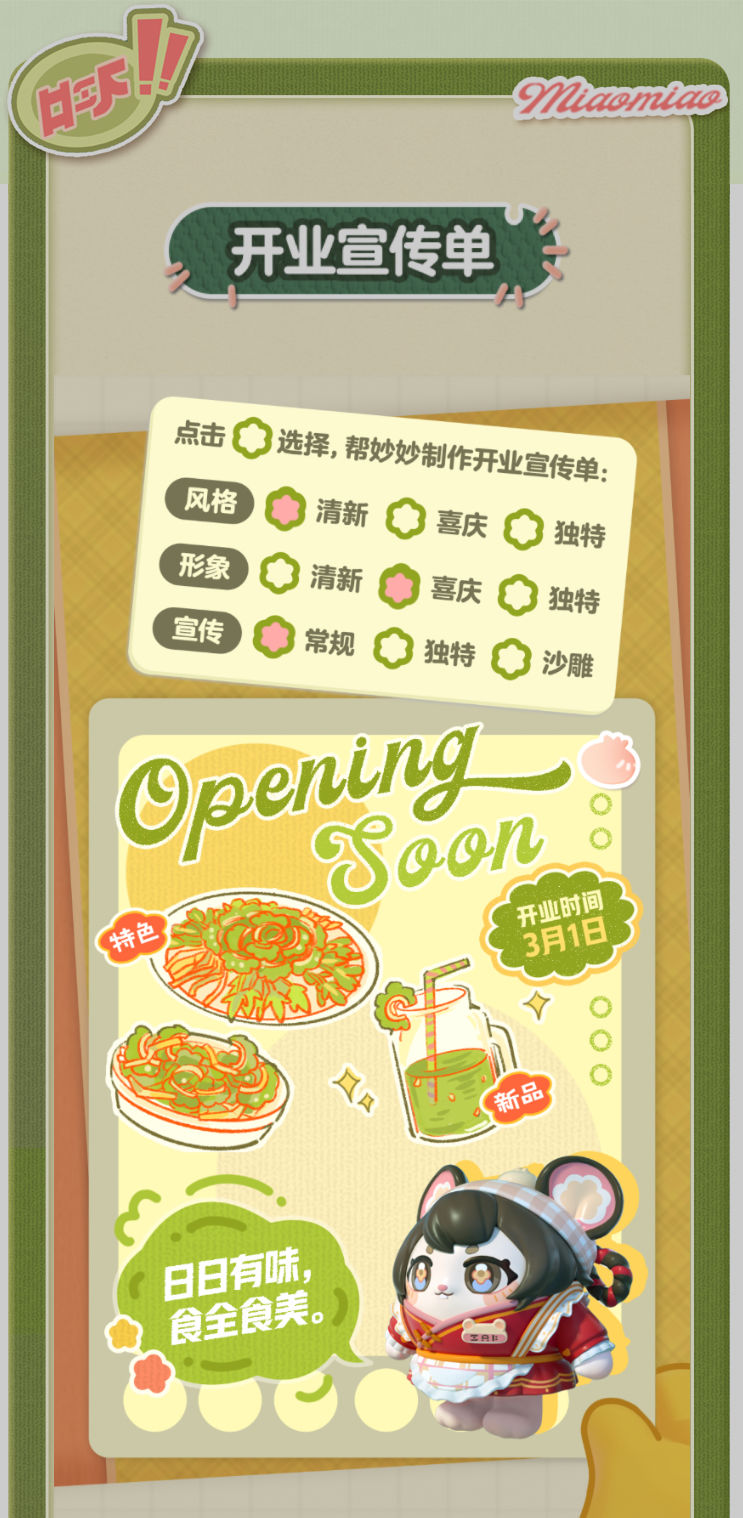 妙妙的店铺筹备将至尾声 蛋仔创业未半却中道歇停 妙妙苦恼的原因竟是 如何定制一张嗨爆全岛的宣传单?! AAA金牌打菜师妙姐(全年无休)在线发出征集 寻觅能完美catch流量密码和 提升店铺人气的“神蛋” 帮助她定制能提升人气的开业宣传单 再三考虑后,妙妙决定将这个难题交给 洋溢着智慧气息和艺术细菌的蛋仔你! 快来帮助妙妙制作一张完美开业宣传单吧!