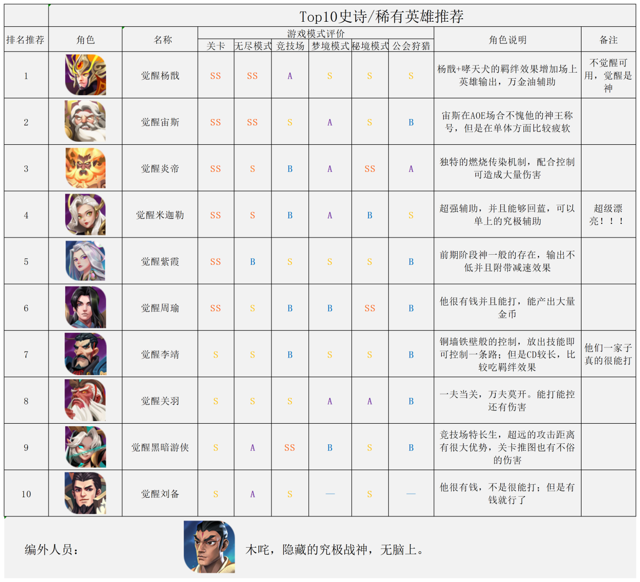 觉醒紫霞可以说的上稀有英雄里有就必上的,觉醒奥义超大范围并附带迟缓,可用于任何模式。自身的伤害水平也属于中上,前期过度神卡。她和觉醒孙悟空也可以组成小羁绊,占用的位置不多,作为副输出补伤害也是不二选择。