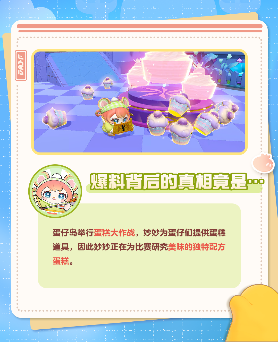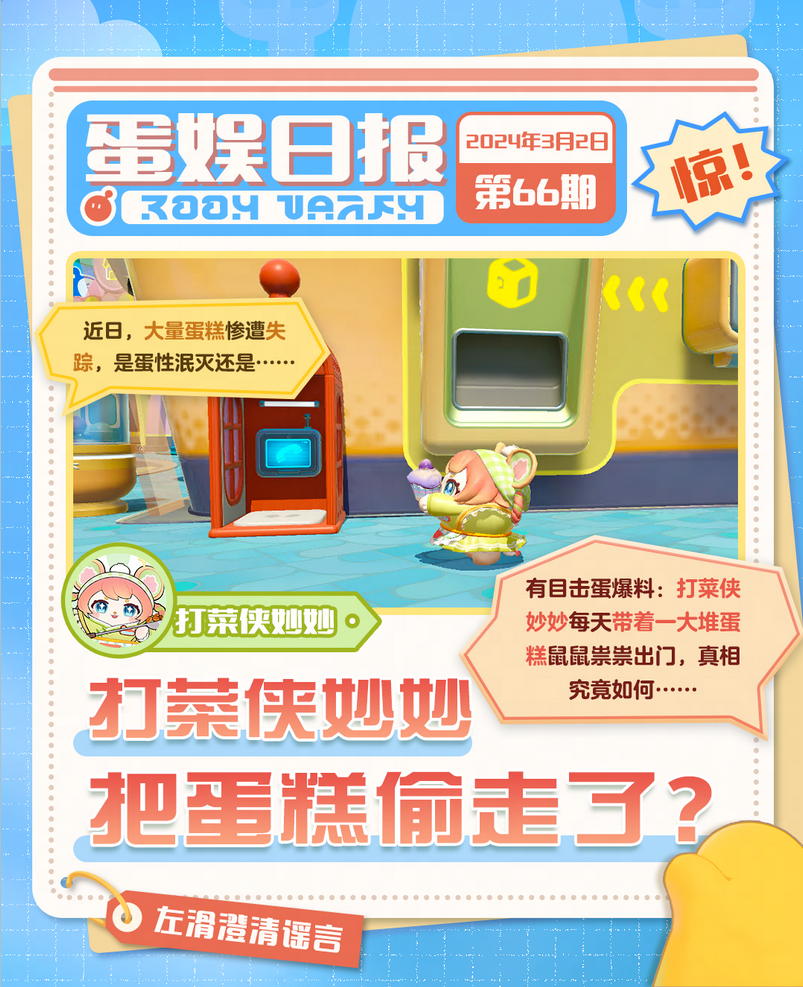 蛋仔TV记者为您报道: 近日,大量蛋糕不知所踪 有目击者称是被打菜侠妙妙悄悄转移 蛋仔岛人气王陷入人品争议,路蛋缘大降 究竟真相如何,本台将持续跟踪报道