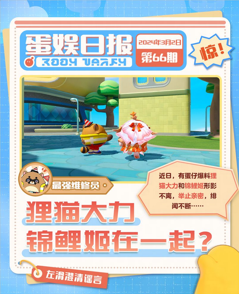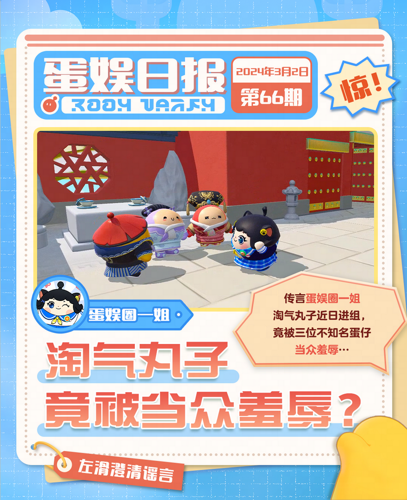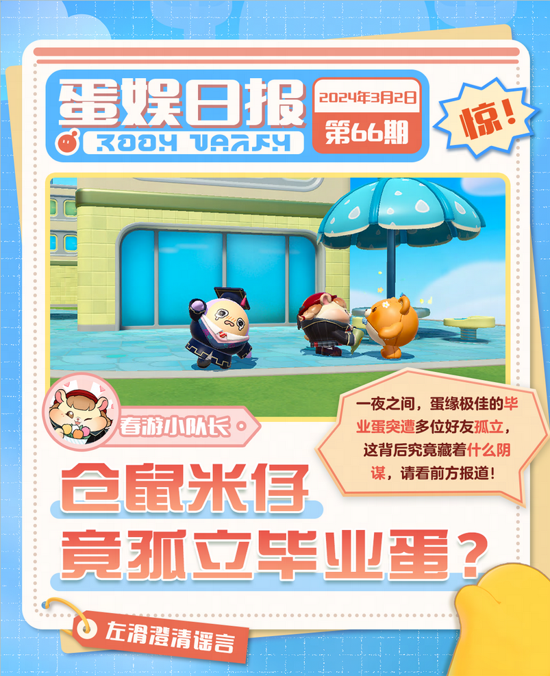 周末周末,皮蛋心情不错 手拿最新发行的蛋娱日报 喝一杯冷饮,纵享美妙假期时光 欸? 等会…这报纸? 啥啥啥??? 蛋娱圈元老淘气丸子遭打压? 狸猫大力与锦鲤姬小锦绯闻不断? 此等巨瓜到底保不保熟啊? 速来跟皮蛋一起看看怎么个事儿!