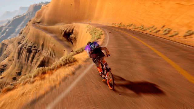 这是游戏《极限国度》的相关内容,展示了游戏里在荒漠山地场景中进行山地自行车特技的画面,搭配趣味文案,传递出享受游戏、放松心情的态度,能让玩家感受极限自行车运动的乐趣。