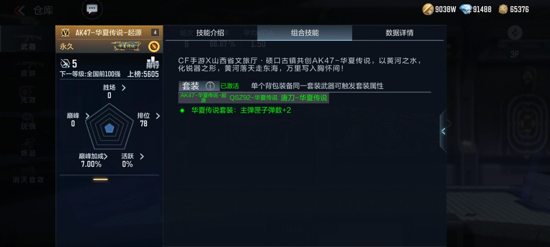 其次是 QSZ92-华夏传说,是全新推出的华夏传说套装中的副武器,也是金V级英雄武器。沿用了AK47-华夏传说的经典外观,在枪身上依旧有着黄河的标识,而且整体外观也十分协调,在枪身上还会有不断散发而出的金色微光粒子。同时也是唯一一把加装了近战攻击方式的QSZ92系列英雄级武器。