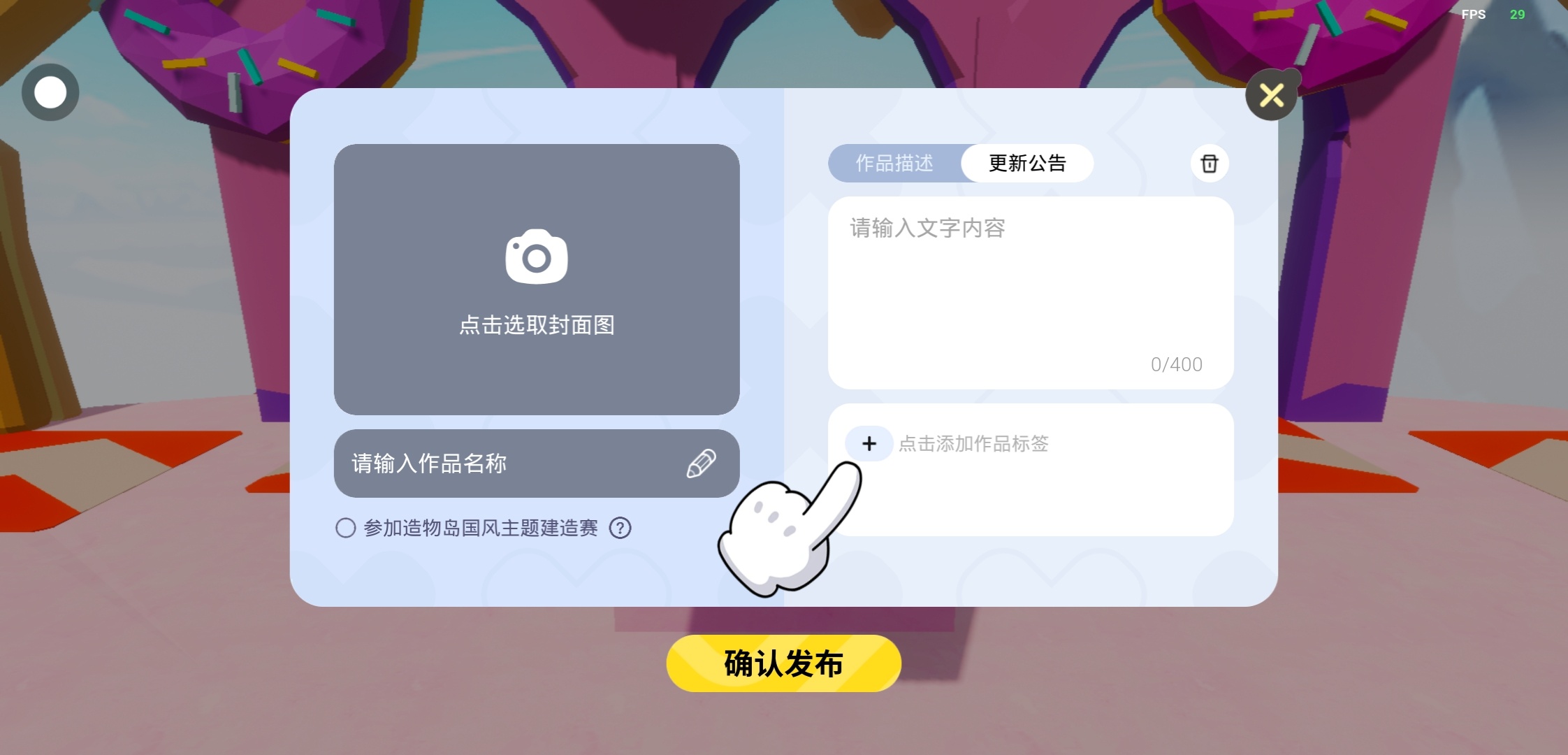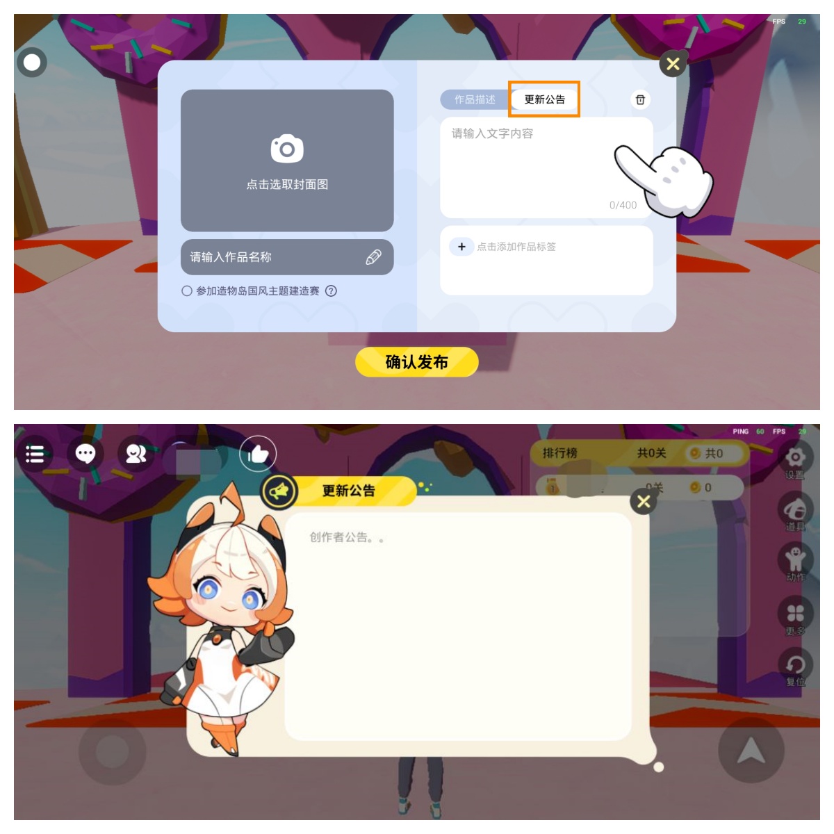 在发布作品界面,点击【作品描述】边上的【更新公告】,即可设置作品的公告,公告内容会展示给每个进入该作品的用户。