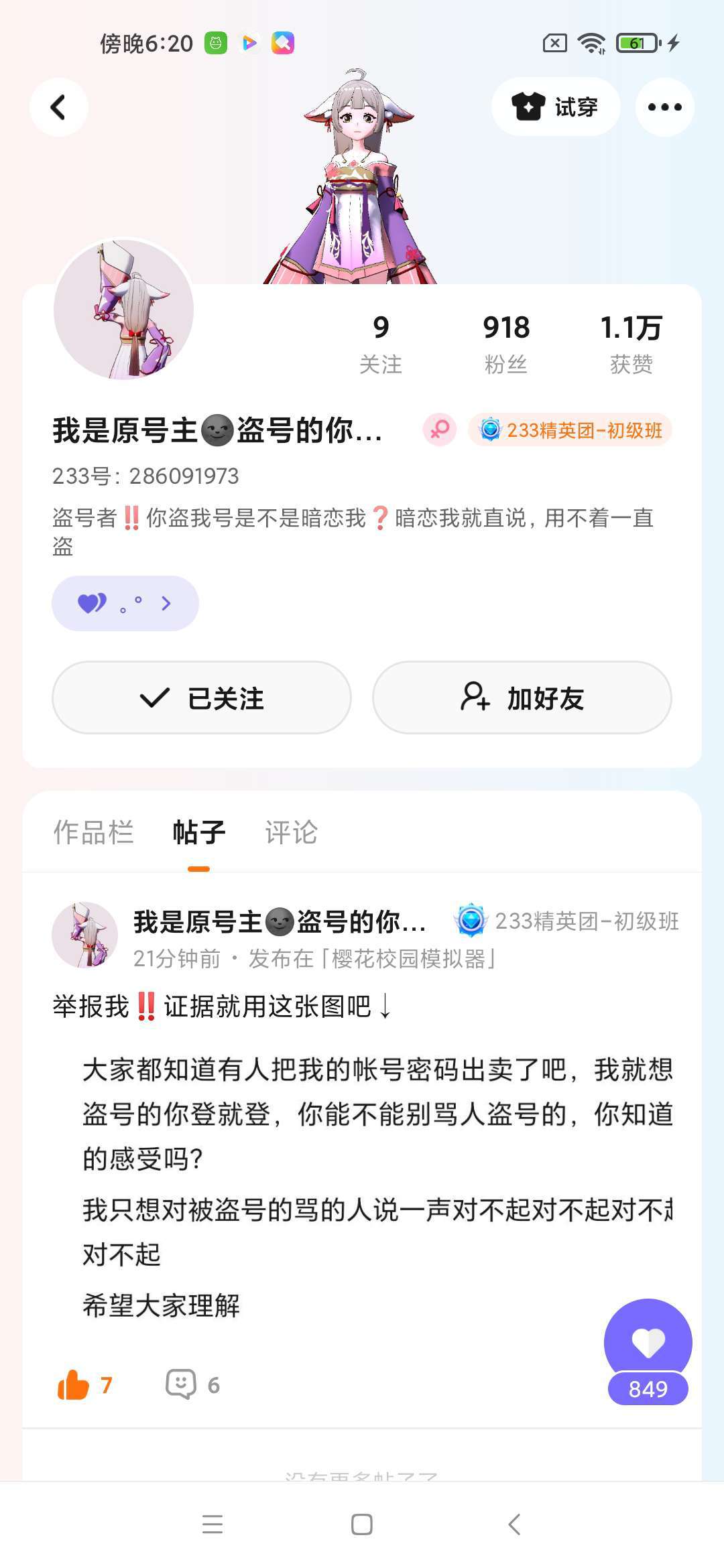 他被盗号了