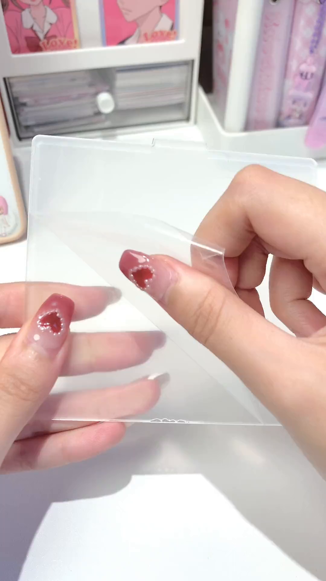 博主分享红色系咕卡套制作过程,拿出透明卡套,搭配爱心背景纸,用Hello Kitty咕卡贴纸等装饰,打造出可爱的咕卡套,展示了咕卡的手工乐趣。